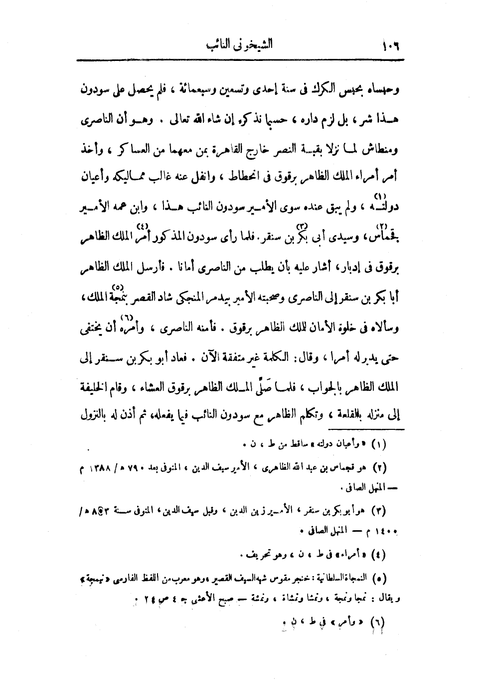 وحبساه بحبس الكرك في سنة إحدى وتسعين وسبعمائة، فلم يحصل على سودون هذا شر، بل لزم داره، حسبما نذكره إن شاء الله تعالى. وهو أن الناصري ومنطاش لما نزلا بقية النصر خارج القاهرة بمن معهما من العساكر، وأخذ أمر أمراء الملك الظاهر برقوق في انحطاط، وانفل عنه غالب مماليكه وأعيان دولته، ولم يبق عنده سوى الأمير سودون النائب هذا، وابن عمه الأمير قجماس، وسيدي أبي بكر بن سنقر. فلما رأى سودون المذكور أمر الملك الظاهر برقوق في إدبار، أشار عليه بأن يطلب من الناصري أماناً. فأرسل الملك الظاهر أبا بكر بن سنقر إلى الناصري وصحبته الأمير بيدمر المنجكي شاد القصر بنمجة الملك، وسألاه في خلوة الأمان للملك الظاهر برقوق. فأمنه الناصري، وأمره أن يختفي حتى يدبر له أمرا، وقال: الكلمة غير متفقة الآن. فعاد أبو بكر بن سنقر إلى الملك الظاهر بالجواب، فلما صلى الملك الظاهر برقوق العشاء، وقام الخليفة إلى منزله بالقلعة، وتكلم الظاهر مع سودون النائب فيما يفعله، ثم أذن له بالنزول