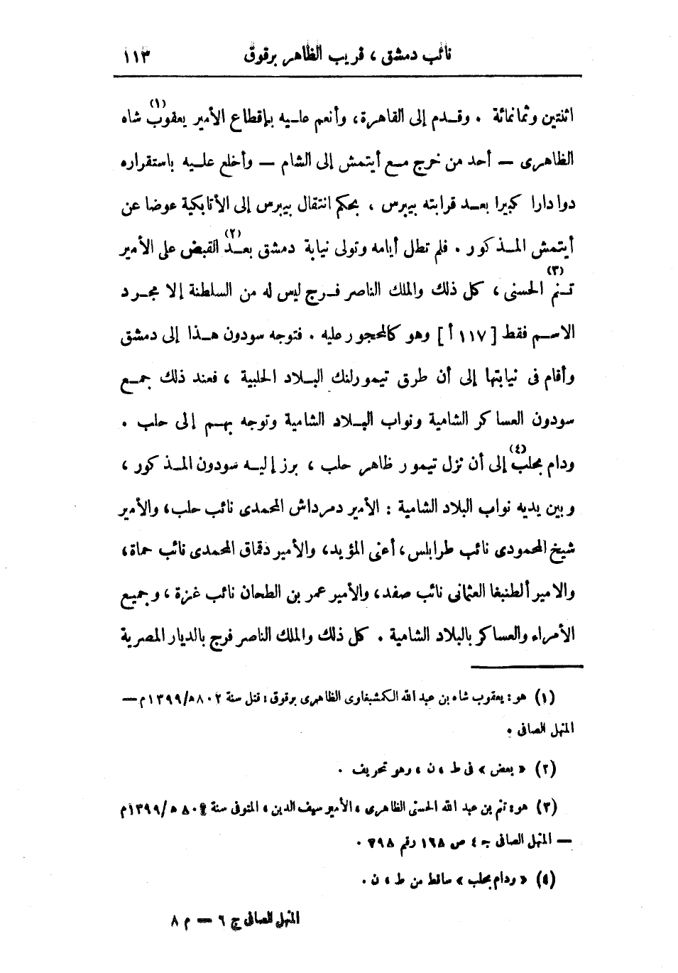 اثنتين وثمانمائة. وقدم إلى القاهرة، وأنعم عليه بإقطاع الأمير يعقوب شاه الظاهري أحد من خرج مع أيتمش إلى الشام وأخلع عليه باستقراره دوادارا كبيراً بعد قرابته بيبرس، بحكم انتقال بيبرس إلى الأتابكية عوضاً عن أيتمش المذكور، فلم تطل أيامه وتولى نيابة دمشق بعد القبض على الأمير تنم الحسنى، كل ذلك والملك الناصر فرج ليس له من السلطنة إلا مجرد الاسم فقط وهو كالمحجور عليه. فتوجه سودون هذا إلى دمشق وأقام في نيابتها إلى أن طرق تيمورلنك البلاد الحلبية، فعند ذلك جمع سودون العساكر الشامية ونواب البلاد الشامية وتوجه بهم إلى حلب. ودام بحلب إلى أن نزل تيمور ظاهر حلب، برز إليه سودون المذكور، وبين يديه نواب البلاد الشامية: الأمير دمرداش المحمدي نائب حلب، والأمير شيخ المحمودي نائب طرابلس، أعني المؤيد، والأمير دقماق المحمدي نائب حماة، والأمير ألطنبغا العثماني نائب صفد، والأمير عمر بن الطحان نائب غزة، وجميع الأمراء والعساكر بالبلاد الشامية. كل ذلك والملك الظاهر فرج بالديار المصرية
