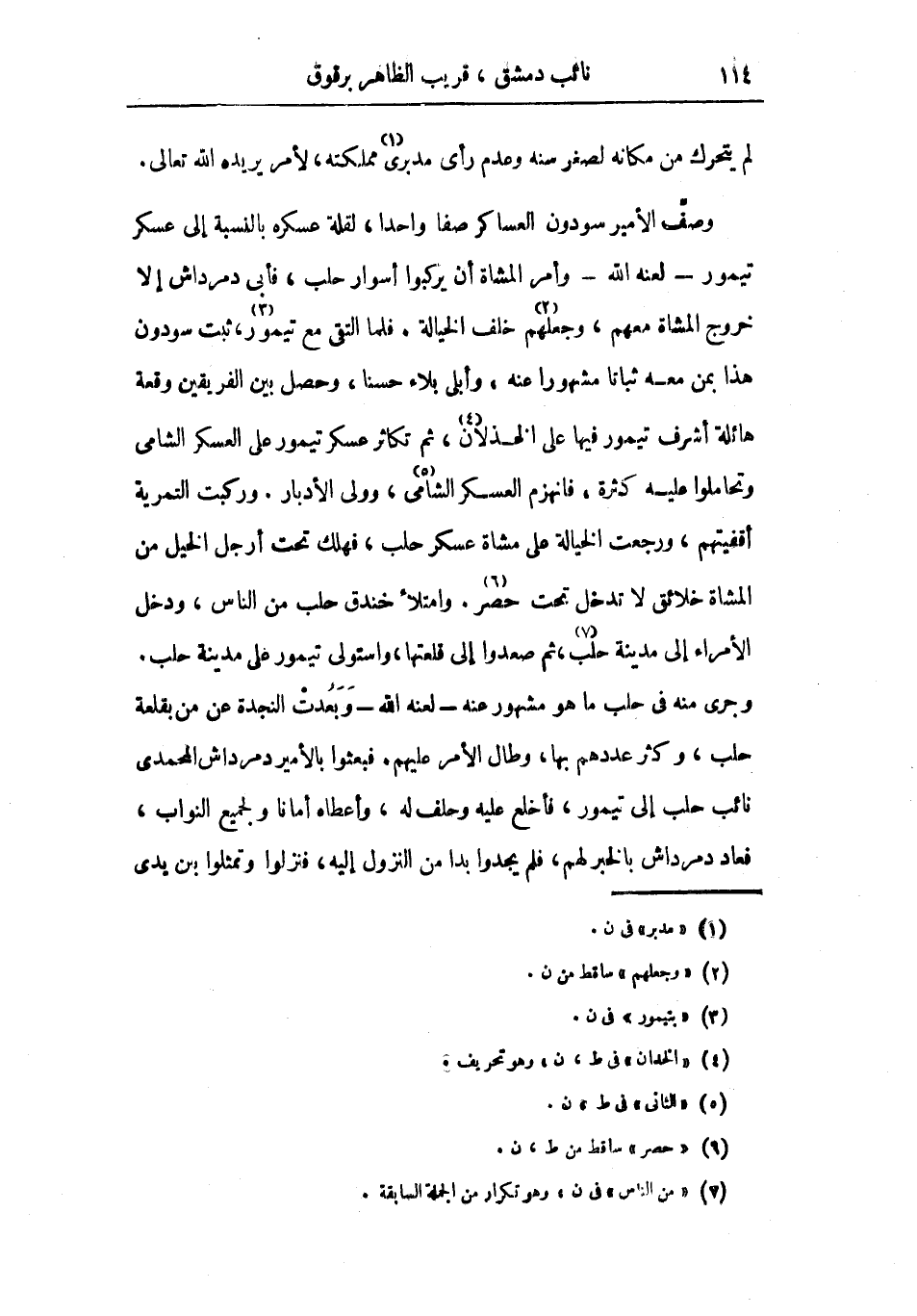 وصف الأمير سودون العساكر صفاً واحداً، لقلة عسكره بالنسبة إلى عسكر تيمور لعنه الله وأمر المشاة أن يركبوا أسوار حلب، فأبى دمرداش إلا خروج المشاة معهم، وجعلهم خلف الخيالة. فلما التقى مع تيمور، ثبت سودون هذا بمن معه ثباتاً مشهوراً عنه وأبلى بلاء حسناً، وحصل بين الفريقين وقعه وتحاملوا عليه كثرة، فانهزم العسكر الشامي، وولي الأدبار. ركبت التمرية أقفيتهم، ورجعت الخيالة على مشاة عسكر حلب، فهلك تحت أرجل الخيل من المشاة خلائق لا تدخل تحت حصر. وامتلأ خندق حلب من الناس، ودخل الأمراء إلى مدينة حلب، ثم صعدوا إلى قلعتها، واستولى تيمور على مدينة حلب. وجرى منه في حلب ما هو مشهور عنه لعنه الله وبعدت النجدة عن من بقلعة حلب، وكثر عددهم بها، وطال الأمر عليهم. فبعثوا بالأمير دمرداش المحمدي نائب حلب إلى تيمور، فأخلع عليه وحلف له، وأعطاه أمانا ولجميع النواب، فعاد دمرداش بالخبر لهم، فلم يجدا بداً من النزول إليه، فنزلوا وتمثلوا بين يدي