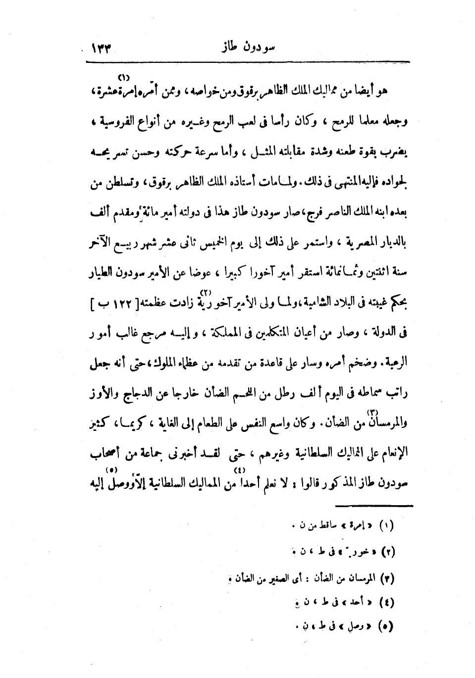 هو أيضاً من مماليك الملك الظاهر برقوق ومن خواصه، وممن أمره إمرة عشرة، وجعله معلماً للرمح، وكان رأسا في لعب الرمح وغيره من أنواع الفروسية، يضرب بقوة طعنه وشدة مقابلته المثل، وأما سرعة حركته وحسن تسريحه لجواده فإليه المنتهى في ذلك. ولما مات أستاذه الملك الظاهر برقوق، وتسلطن من بعده ابنه الملك الناصر فرج، صار سودون طاز هذا في دولته أمير مائة ومقدم ألف بالديار المصرية، واستمر على ذلك إلى يوم الخميس ثاني عشر شهر ربيع الآخر سنة اثنتين وثمانمائة استقر أمير آخورا كبيراً، عوضاً عن الأمير سودون الطيار بحكم غيبته في البلاد الشامية، ولما ولي الأمير آخورية زادت عظمته في الدولة، وصار من أعيان المتكلمين في المملكة، وإليه مرجع غالب أمور الرعية. وضخم أمره وسار على قاعدة من تقدمه من عظماء الملوك، حتى أنه جعل راتب سماطه في اليوم ألف رطل من اللحم الضأن خارجاً عن الدجاج والأوز والمرمسان من الضأن. وكان واسع النفس على الطعام إلى الغاية، كريماً، كثير الإنعام على المماليك السلطانية وغيرهم، حتى لقد أخبرني جماعة من أصحاب سودون طاز المذكور قالوا: لا نعلم أحداً من المماليك السلطانية إلا ووصل إليه