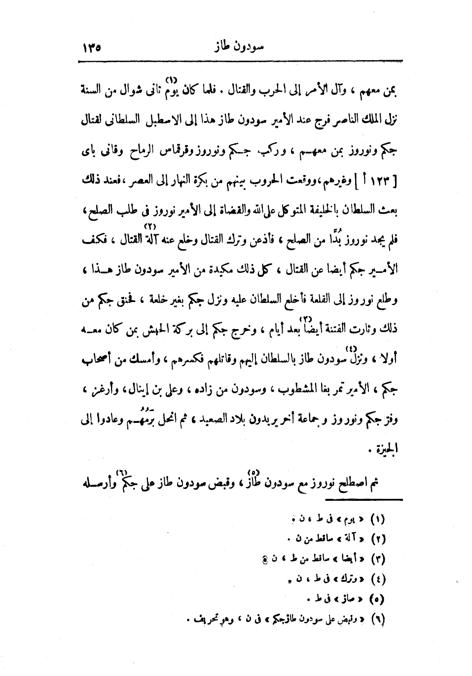 بمن معهم، وآل الأمراء إلى الحرب والقتال. فلما كان يوم ثاني شوال من السنة نزل الملك الناصر فرج عند الأمير سودون طاز هذا إلى الأسطبل السلطاني لقتال جكم ونوروز بمن معهم، وركب جكم ونوروز وقرقماس الرماح وقاني باي وغيرهم، ووقعت الحروب بينهم من بكرة النهار إلى العصر، فعند ذلك بعث السلطان بالخليفة المتوكل على الله والقضاة إلى الأمير نوروز في طلب الصلح، فلم يجد نوروز بداً من الصلح، فأذعن وترك القتال وخلع عنه آلة القتال، فكف الأمير جكم أيضاً عن القتال، كل ذلك مكيدة من الأمير سودون طاز هذا، وطلع نوروز إلى القلعة فأخلع السلطان عليه ونزل جكم بغير خلعة، فحنق جكم من ذلك وثارت الفتنة أيضاً بعد أيام، وخرج جكم إلى بركة الحبش بمن كان معه أولاً، ونزل سودون طاز بالسلطان إليهم وقاتلهم فكسرهم، وأمسك من أصحاب جكم، الأمير تمربغا المشطوب، وسودون من زاده، وعلي بن إينال، وأرغز، وفرجكم ونوروز وجماعة أخر يريدون بلاد الصعيد، ثم انحل برمحهم وعادوا إلى الجيزة.