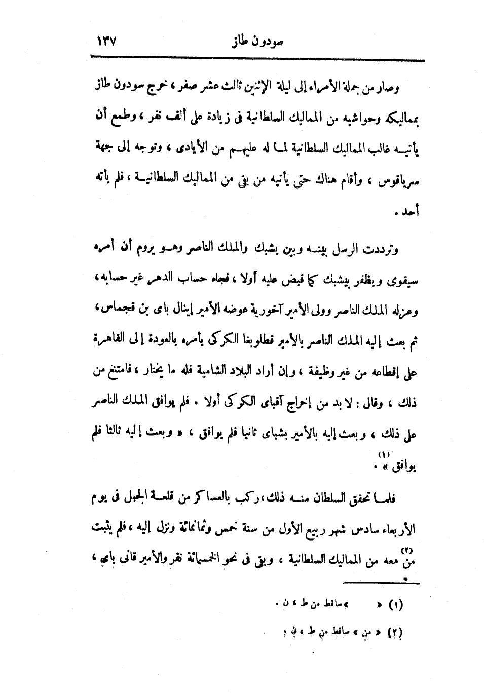 وصار من جملة الأمراء إلى ليلة الإثنين ثالث عشر صفر، خرج سودون طاز بمماليكه وحواشيه من المماليك السلطانية في زيادة على ألف نفر، وطمع أن يأتيه غالب المماليك السلطانية لما له عليهم من الأيادي، وتوجه إلى جهة سرياقوس، وأقام هناك حتى يأتيه من بقي من المماليك السلطانية، فلم يأته أحد.