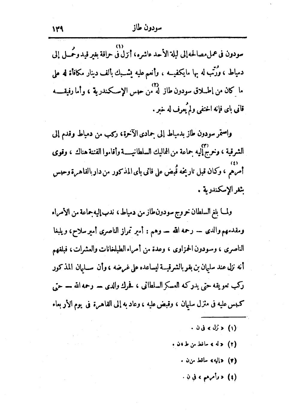 ولما بلغ السلطان خروج سودون طاز من دمياط، ندب إليه جماعة من الأمراء ومقدمهم والدي رحمه الله وهم: أمير تمراز الناصري أمير سلاح، ويلبغا الناصري، وسودون الحمزاوي، وعدة من أمراء الطبلخانات والعشرات، فبلغهم أنه نزل عند سليمان بن بقر بالشرقية ليساعده على غرضه، وأن سليمان المذكور ركب تعويقه حتى يدركه العسكر السلطاني، فحرك والدي رحمه الله حتى كبس عليه في منزل سليمان، وقبض عليه، وعاد به إلى القاهرة في يوم الأربعاء