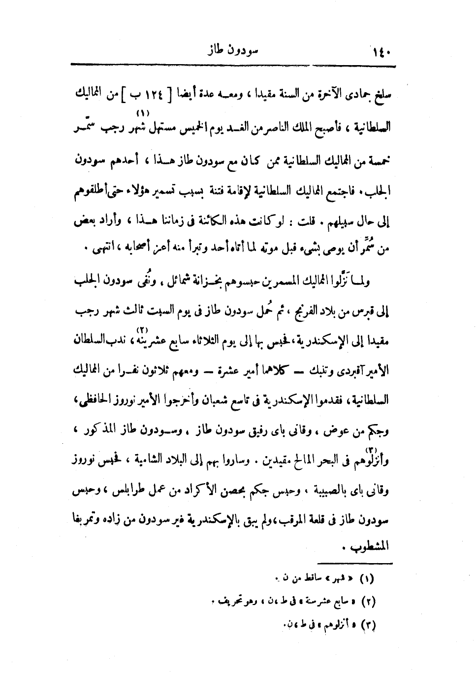 سلخ جمادى الآخرة من السنة مقيدا، ومعه عدة أيضاً من المماليك السلطانية، فأصبح الملك الناصر من الغد يوم الخميس مستهل شهر رجب سمر خمسة من المماليك السلطانية ممن كان مع سودون طاز هذا، أحدهم سودون الجلب. فاجتمع المماليك السلطانية لإقامة فتنة بسبب تسمير هؤلاء حتى أطلقوهم إلى حال سبيلهم. قلت: لو كانت هذه الكائنة في زماننا هذا، وأراد بعض من سمر أن يوصي بشيء قبل موته لما أتاه أحد وتبرأ منه أعز أصحابه، انتهى.