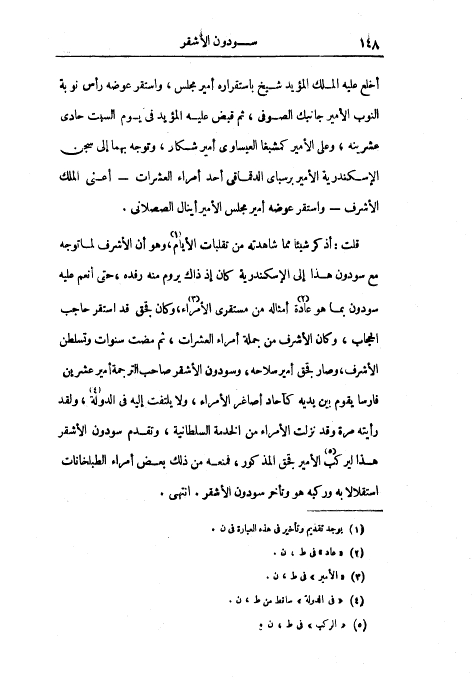 قلت: أذكر شيئاً مما شاهدته من تقلبات الأيام، وهو أن الأشرف لما توجه مع سودون هذا إلى الإسكندرية كان إذ ذاك يروم منه رفده، حتى أنعم عليه سودون بما هو عادة أمثاله من مستقري الأمراء، وكان قجق قد استقر حاجب الحجاب، وكان الأشرف من جملة أمراء العشرات، ثم مضت سنوات وتسلطن الأشرف، وصار قجق أمير سلاحه، وسودون الأشقر صاحب الترجمة أمير عشرين فارساً يقوم بين يديه كآحاد أصاغر الأمراء، ولا يلتفت إليه في الدولة، ولقد رأيته مرة وقد نزلت الأمراء من الخدمة السلطانية، وتقدم سودون الأشقر هذا ليركب الأمير قجق المذكور، فمنعه من ذلك بعض أمراء الطبلخانات استقلالاً به وركبه هو وتأخر سودون الأشقر. انتهى.