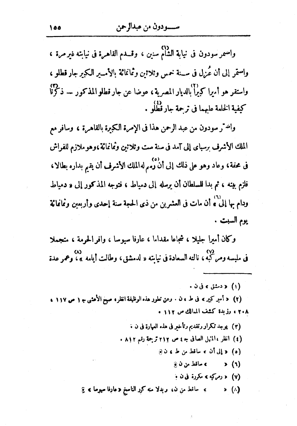 واستمر سودون من عبد الرحمن هذا في الإمرة الكبيرة بالقاهرة، وسافر مع الملك الأشرف برسباي إلى آمد في سنة ست وثلاثين وثمانمائة، وهو ملازم للفراش في محفة، وعاد وهو على ذلك إلى أن رسم له الملك الأشرف أن يقيم بداره بطالاً، فلزم بيته، ثم بدا للسلطان أن يرسله إلى دمياط، فتوجه المذكور إلى دمياط ودام بها إلى أن مات في العشرين من ذي الحجة سنة إحدى وأربعين وثمانمائة يوم السبت.