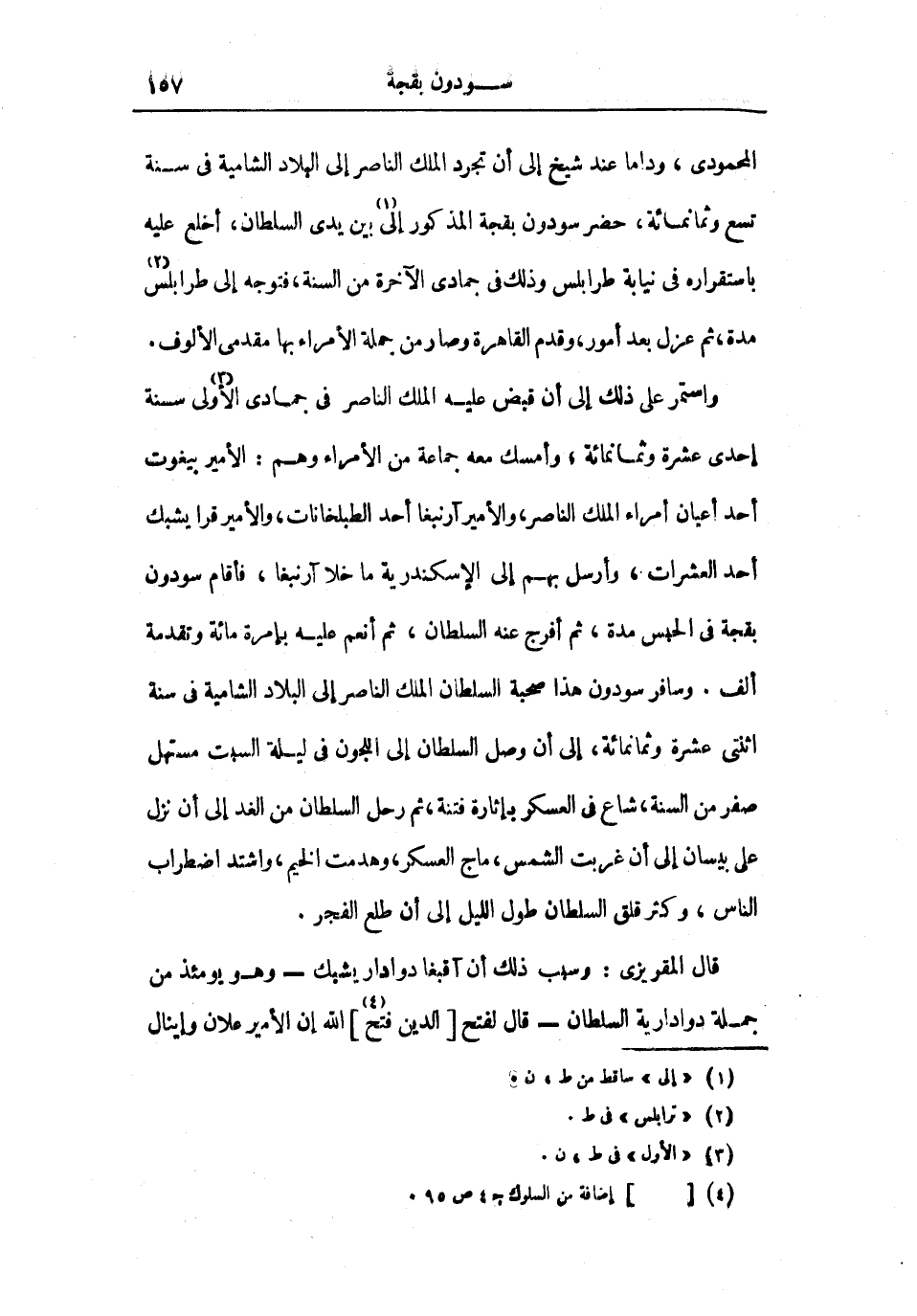 المحمودي، وداما عند شيخ إلى أن تجرد الملك الناصر إلى البلاد الشامية في سنة تسع وثمانمائة، حضر سودون بقجة المذكور إلى بين يدي السلطان، أخلع عليه باستقراره في نيابة طرابلس وذلك في جمادى الآخرة من السنة، فتوجه إلى طرابلس مدة، ثم عزل بعد أمور، وقدم القاهرة وصار من جملة الأمراء بها مقدمي الألوف.