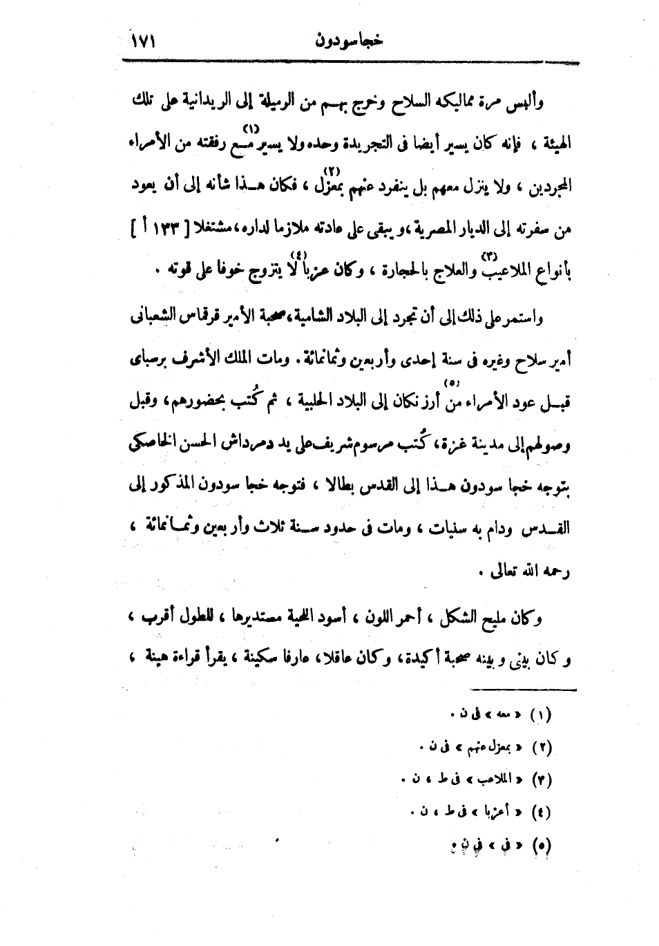 وألبس مرة مماليكه السلاح وخرج بهم من الرميلة إلى الريدانية على تلك الهيئة، فإنه كان يسيراً أيضاً في التجريدة وحده ولا يسير مع رفقته من الأمراء المجردين، ولا ينزل معهم بل ينفرد عنهم بمعزل، فكان هذا شأنه إلى يعود من سفرته إلى الديار المصرية، ويبقى على عادته ملازماً لداره، مشتغلاً بأنواع الملاعيب والعلاج بالحجارة، وكان عزباً لا يتزوج خوفاً على قوته.