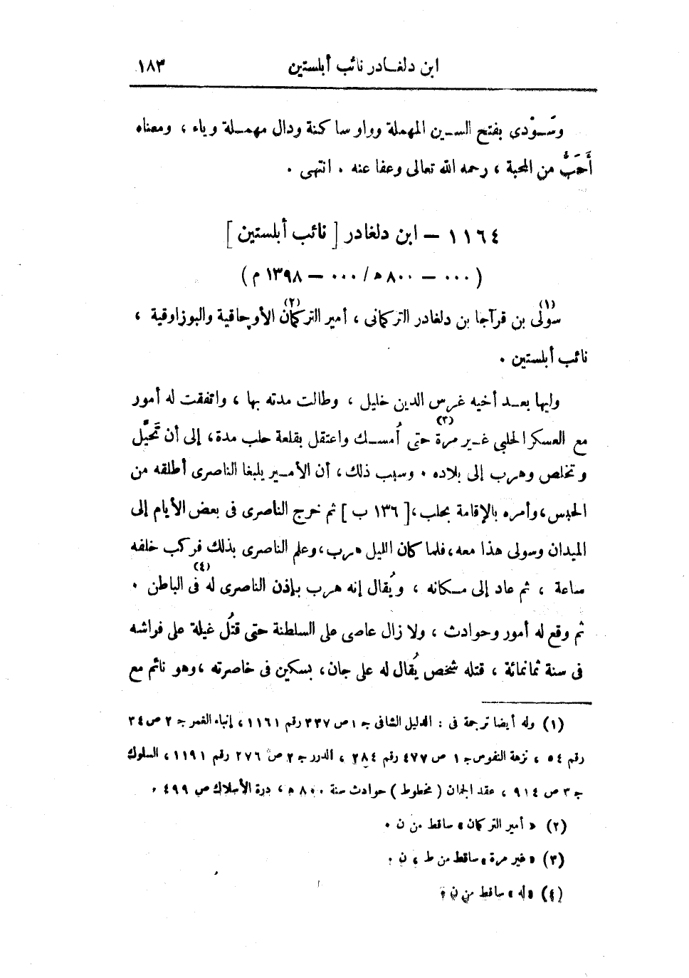 وليها بعد أخيه غرس الدين خليل، وطالت مدته بها، واتفقت له أمور مع العسكر الحلبي غير مرة حتى أمسك واعتقل بقلعة حلب مدة، إلى أن تحيل وتخلص وهرب إلى بلاده. وسبب ذلك، أن الأمير يلبغا الناصري أطلقه من الحبس، وأمره بالإقامة بحلب، ثم خرج الناصري في بعض الأيام إلى الميدان وسولى هذا معه، فلما كان الليل هرب، وعلم الناصري بذلك فركب خلفه ساعة، ثم عاد إلى مكانه، ويقال إنه هرب بإذن الناصري له في الباطن. ثم وقع له أمور وحوادث، ولا زال عاصي على السلطنة حتى قتل غيلة على فراشه في سنة ثمانمائة، قتله شخص يقال له على جان، بسكين في خاصرته، وهو نائم مع