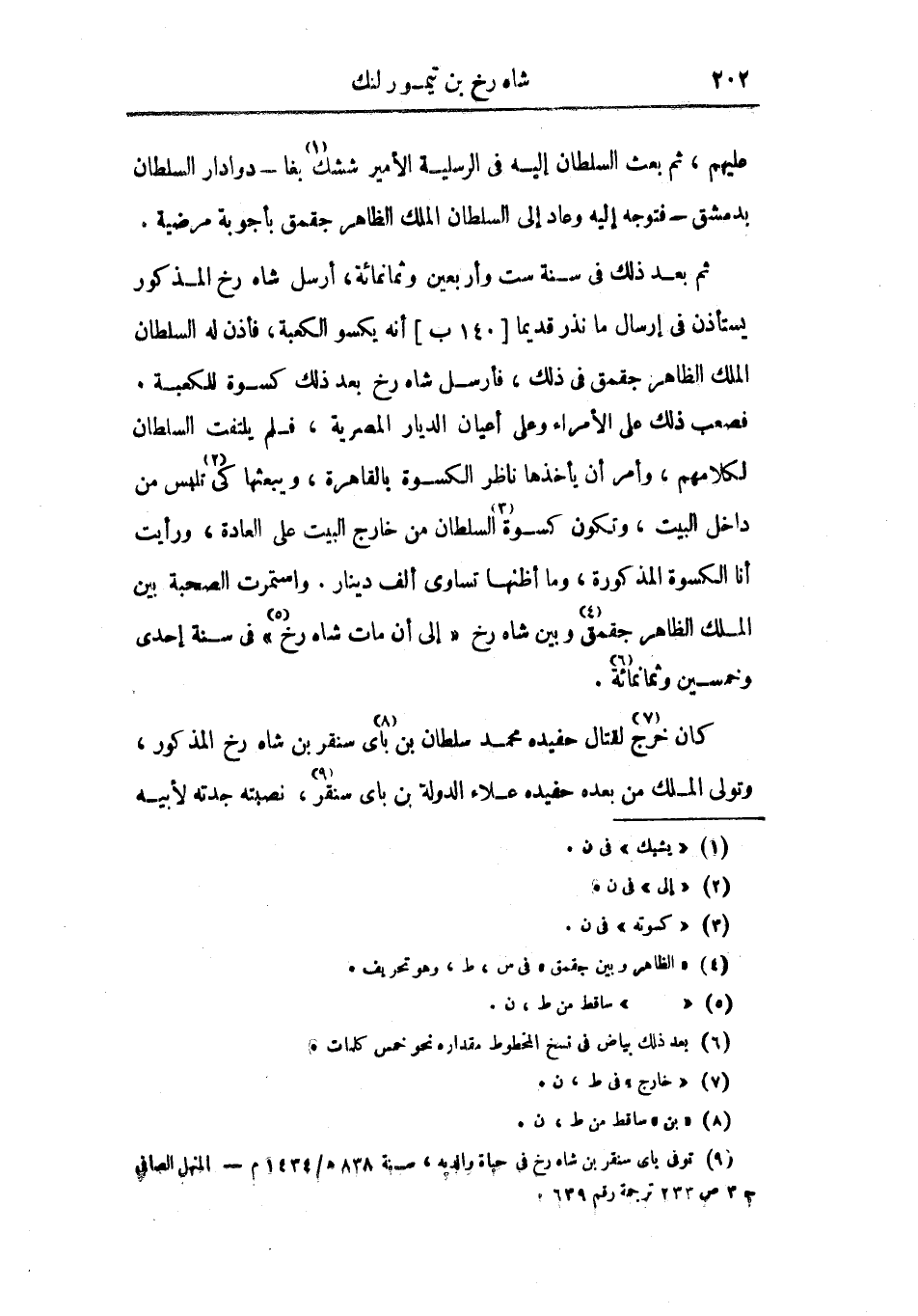 ثم بعد ذلك في سنة ست وأربعين وثمانمائة، أرسل شاه رخ المذكور يستأذن في إرسال ما نذر قديماً أنه يكسو الكعبة، فأذن له السلطان الملك الظاهر جقمق في ذلك، فأرسل شاه رخ بعد ذلك كسوة للكعبة. فصعب ذلك على الأمراء وعلى أعيان الديار المصرية، فلم يلتفت السلطان لكلامهم، وأمر أن يأخذها ناظر الكسوة بالقاهرة، ويبعثها كي تلبس من داخل البيت، وتكون كسوة السلطان من خارج البيت على العادة، ورأيت أنا الكسوة المذكورة، وما أظنها تساوي ألف دينار. واستمرت الصحبة بين الملك الظاهر جقمق وبين شاه رخ إلى أن مات شاه رخ في سنة إحدى وخمسين وثمانمائة.
