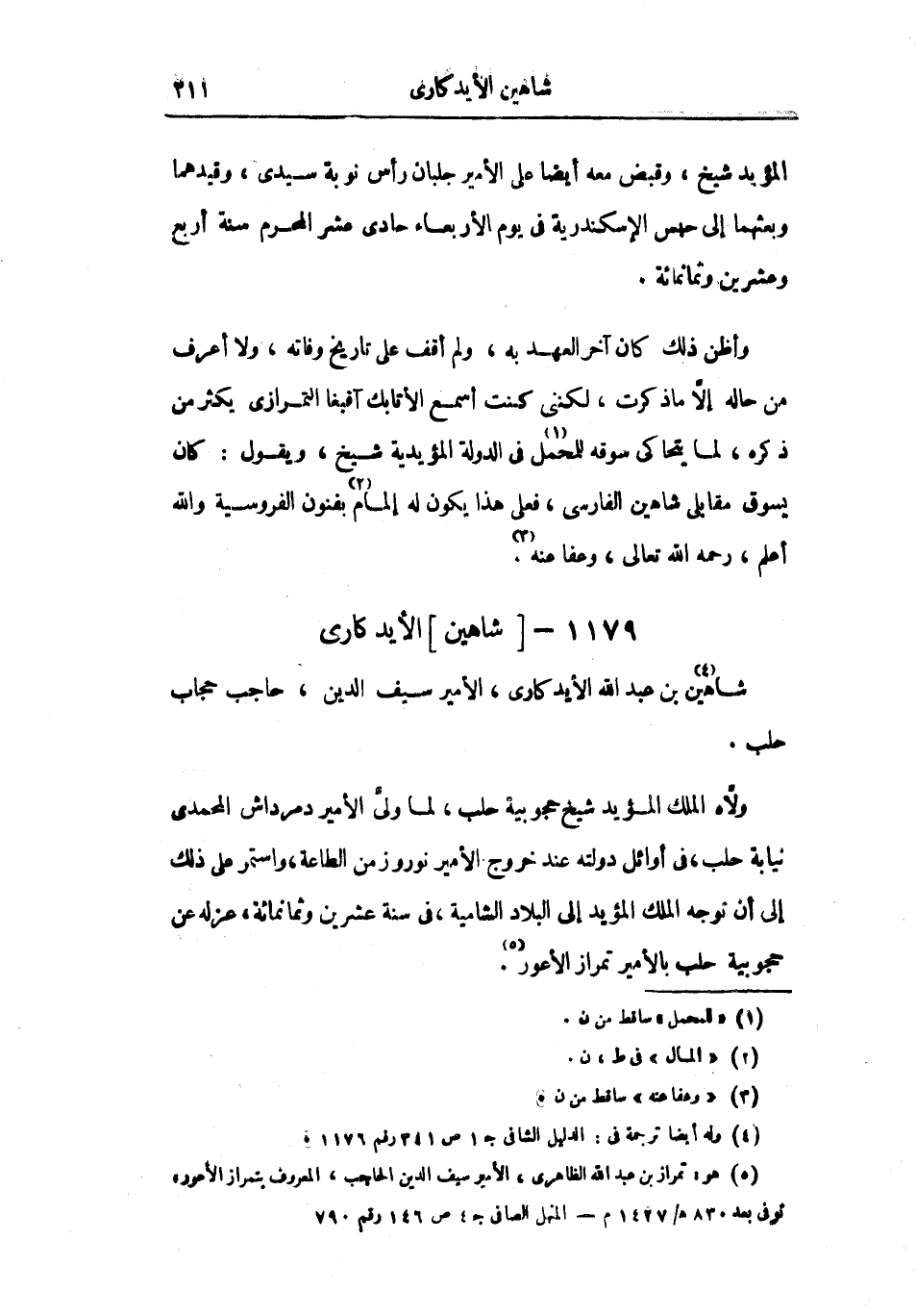 وأظن ذلك كان آخر العهد به، ولم أقف على تاريخ وفاته، ولا أعرف من حاله إلا ما ذكرت، لكنني كنت أسمع الأتابك أقبغا التمرازي يكثر من ذكره، لما يتحاكى سوقه للمحمل في الدولة المؤيدية شيخ، ويقول: كان يسوق مقابلي شاهين الفارسي، فعلى هذا يكون له إلمام بفنون الفروسية والله أعلم، رحمه الله تعالى، وعفا عنه.