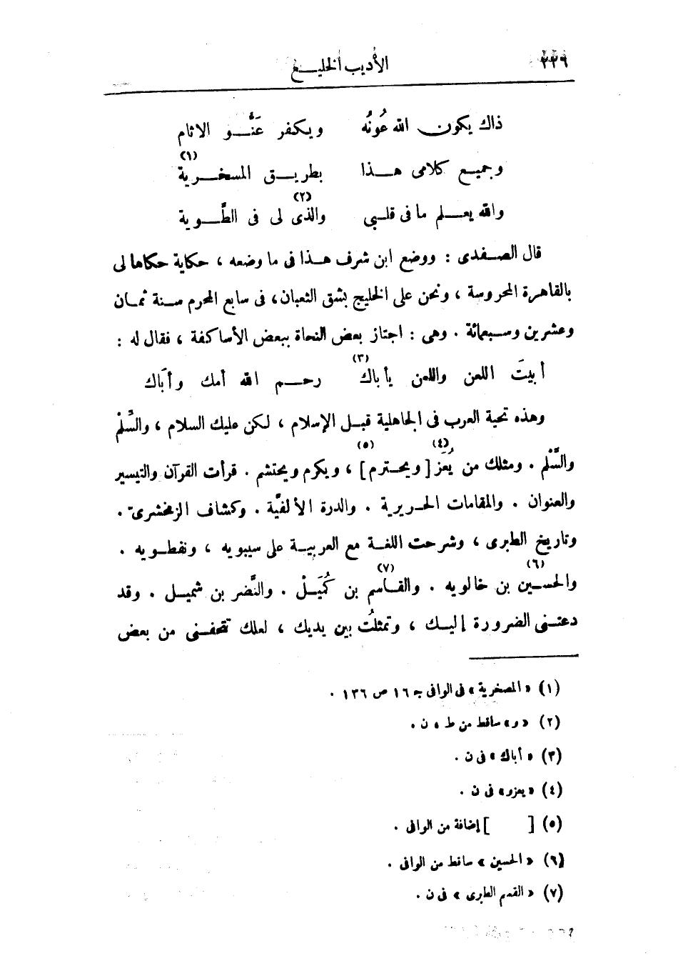 وهذه تحية العرب في الجاهلية قبل الإسلام، لكن عليك السلام، والسِّلْم والسَّلْم. ومثلك من يعز ويحترم، ويكرم ويحتشم. قرأت القرآن والتيسير والعنوان. والمقامات الحريرية. والدرة الألفية. وكشاف الزمخشري. وتاريخ الطبري، وشرحت اللغة مع العربية على سيبويه، ونفطويه. والحسين بن خالويه. والقاسم بن كميل. والنضر بن شميل. وقد دعتني الضرورة إليك، وتمثلت بين يديك، لعلك تتخفني من بعض