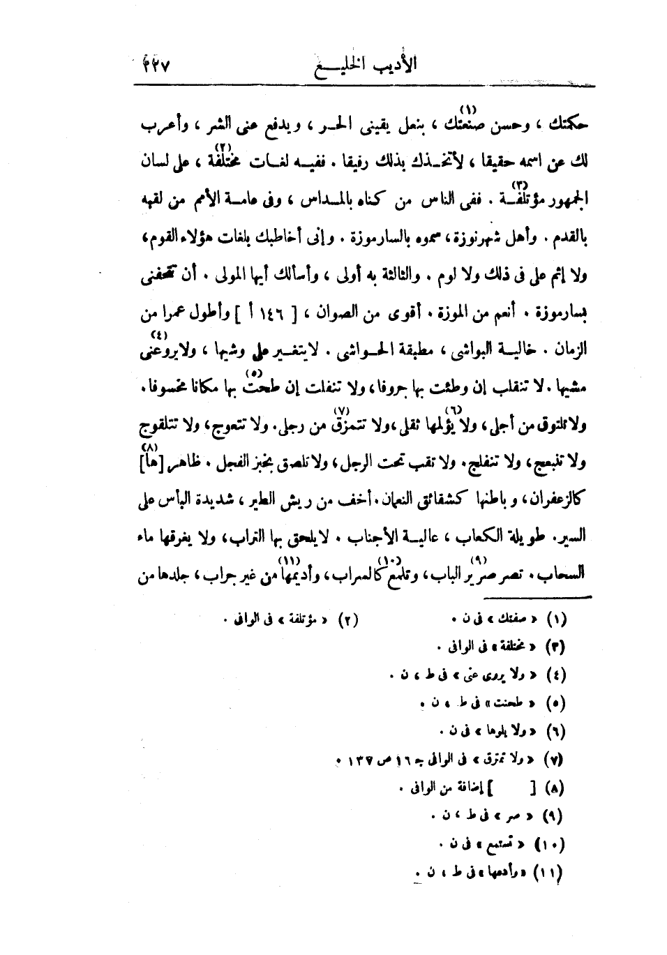 حكمتك، وحسن صنعتك، بنعل يقيني الحر، ويدفع عني الشر، وأعرب لك عن اسمه حقيقاً، لأتخذك بذلك رفيقاً. ففيه لغات مختلفة، على لسان الجمهور مؤتلفة. ففي الناس من كناه بالمداس، وفي عامة الأمم من لقبه بالقدم. وأهل شهرنوزة، سموه بالسارموزة. وإني أخاطبك بلغات هؤلاء القوم، ولا إثم علي في ذلك ولا لوم. والثالثة به أولى، وأسألك أيها المولى. أن تتحفني بسارموزة. أنعم من الموزة. أقوى من الصوان، وأطول عمراً من الزمان. خالية البواشي، مطبقة الحواشي. لا يتغير على وشيها، ولا يروعني مشيها. لا تنقلب إن وطئت بها جروفا، ولا تنفلت إن طحت بها مكانا مخسوفاً. ولا تلتوق من أجلي، ولا يؤلمها ثقلي، ولا تتمزق من رجلي. ولا تتعوج، ولا تتلقوج ولا تنبعج، ولا تنفلج. ولا تقب تحت الرجل، ولا تلصق بخبز الفجل. ظاهرها كالزعفران، وباطنها كشقائق النعمان. أخف من ريش الطير، شديدة البأس على السير. طويلة الكعاب، عالية الأجناب. لا يلحق بها التراب، ولا يغرقها ماء السحاب. تصر صرير الباب، وتلمع كالسراب، وأديمها من غير جراب، جلدها من