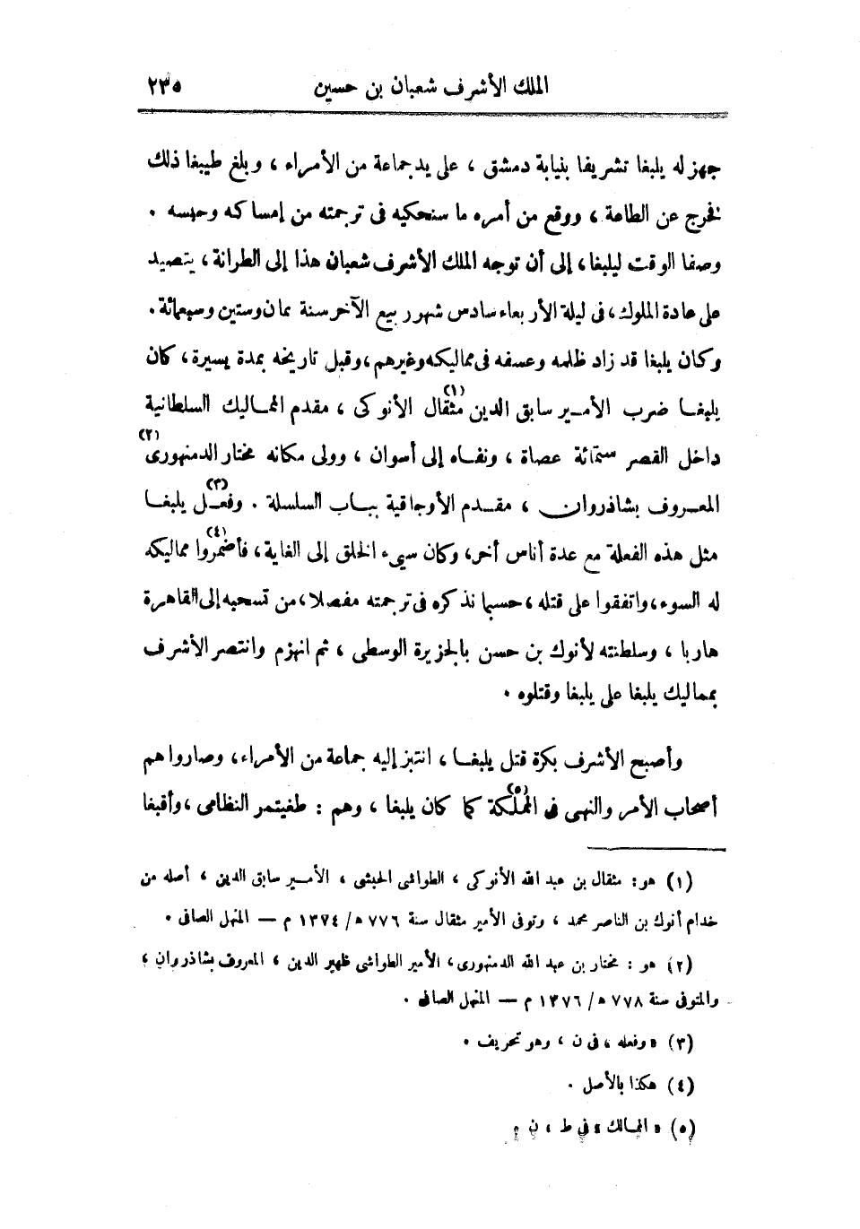 جهز له يلبغا تشريفاً بنيابة دمشق، على يد جماعة من الأمراء، وبلغ طيبغا ذلك فخرج عن الطاعة، ووقع من أمره ما سنحكيه في ترجمته من إمساكه وحبسه. وصفا الوقت ليلبغا، إلى أن توجه الملك الأشرف شعبان هذا إلى الطرانة، يتصيد على عادة الملوك، في ليلة الأربعاء سادس شهر ربيع الآخر سنة ثمان وستين وسبعمائة. وكان يلبغا قد زاد ظلمه وعسفه في مماليكه وغيرهم، وقبل تاريخه بمدة يسيرة، كان يلبغا ضرب الأمير سابق الدين مثقال الأنوكي، مقدم المماليك السلطانية داخل القصر ستمائة عصاة، ونفاه إلى أسوان، وولي مكانه مختار الدمنهوري المعروف بشاذروان، مقدم الأوجاقية بباب السلسلة. وفعل يلبغا مثل هذه الفعلة مع عدة أناس أخر، وكان سيىء الخلق إلى الغاية، فأضمروا مماليكه له السوء، واتفقوا على قتله، حسبما نذكره في ترجمته مفصلاً، من تسحبه إلى القاهرة هارباً، وسلطنته لأنوك بن حسن بالجزيرة الوسطى، ثم انهزم وانتصر الأشرف بمماليك يلبغا على يلبغا وقتلوه.