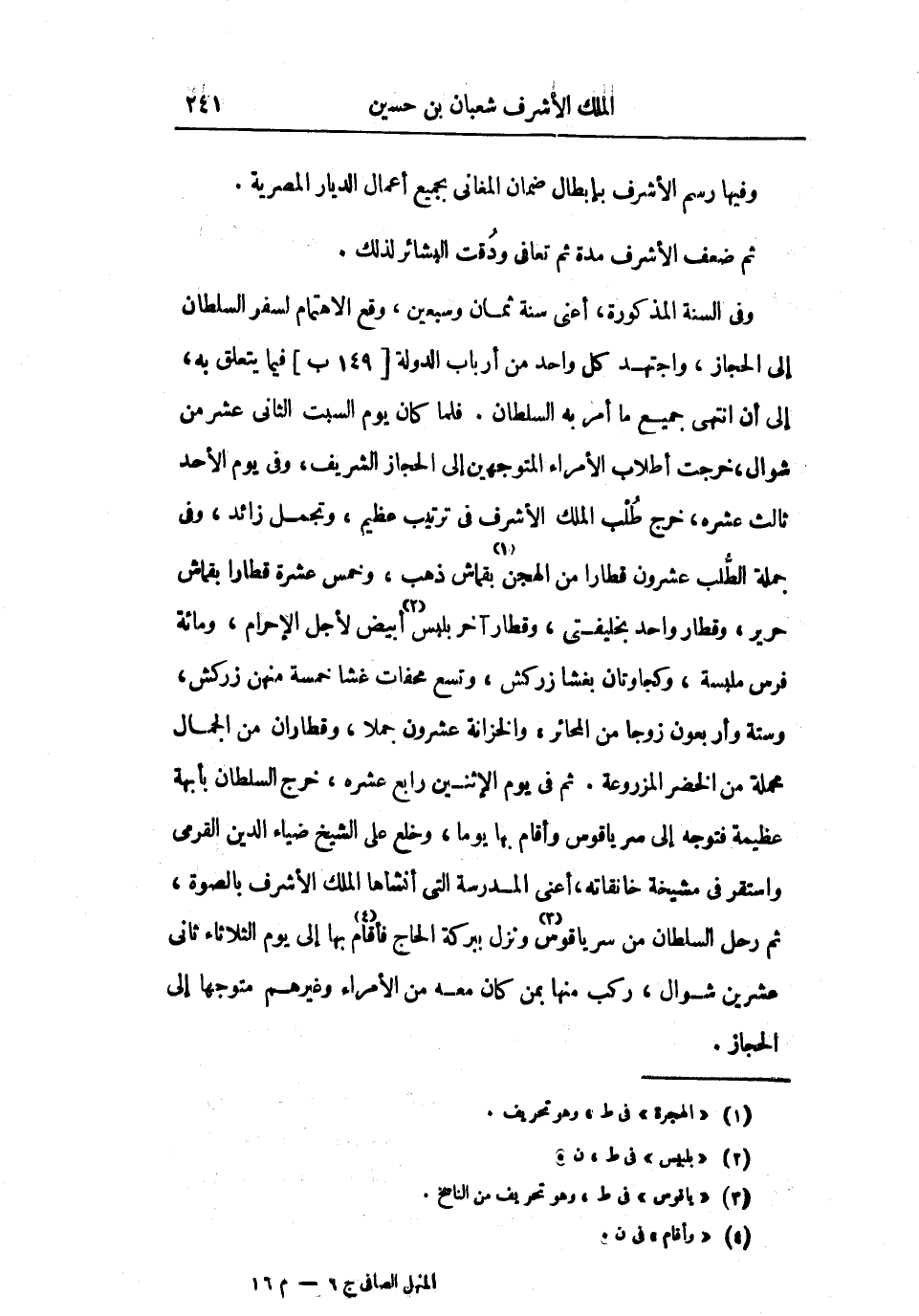 وفي السنة المذكورة، أعني سنة ثمان وسبعين، وقع الاهتمام لسفر السلطان إلى الحجاز، واجتهد كل واحد من أرباب الدولة فيما يتعلق به، إلى أن انتهى جميع ما أمر به السلطان. فلما كان يوم السبت الثاني عشر من شوال، خرجت أطلاب الأمراء المتوجهين إلى الحجاز الشريف، وفي يوم الأحد ثالث عشرة، خرج طلب الملك الأشرف في ترتيب عظيم، وتجمل زائد، وفي جملة الطلب عشرون قطاراً من الهجن بقماش ذهب، وخمس عشرة قطاراً بقماش حرير، وقطار واحد بخليفتي، وقطار آخر بلبس أبيض لأجل الإحرام، ومائة فرس ملبسة، وكجاوتان بغشا زركش، وتسع محفات غشا خمسة منهن زركش، وستة وأربعون زوجاً من المحائر، والخزانة عشرون جملاً، وقطاران من الجمال محملة من الخضر المزروعة. ثم في يوم الإثنين رابع عشرة، خرج السلطان بأبهة عظيمة فتوجه إلى سرياقوس وأقام بها يوماً، وخلع على الشيخ ضياء الدين القرمي واستقر في مشيخة خانقاته، أعني المدرسة التي أنشأها الملك الأشرف بالصوة، ثم رحل السلطان من سرياقوس ونزل ببركة الحاج فأقام بها إلى يوم الثلاثاء ثاني عشرين شوال، ركب منها بمن كان معه من الأمراء وغيرهم متوجهاً إلى الحجاز.