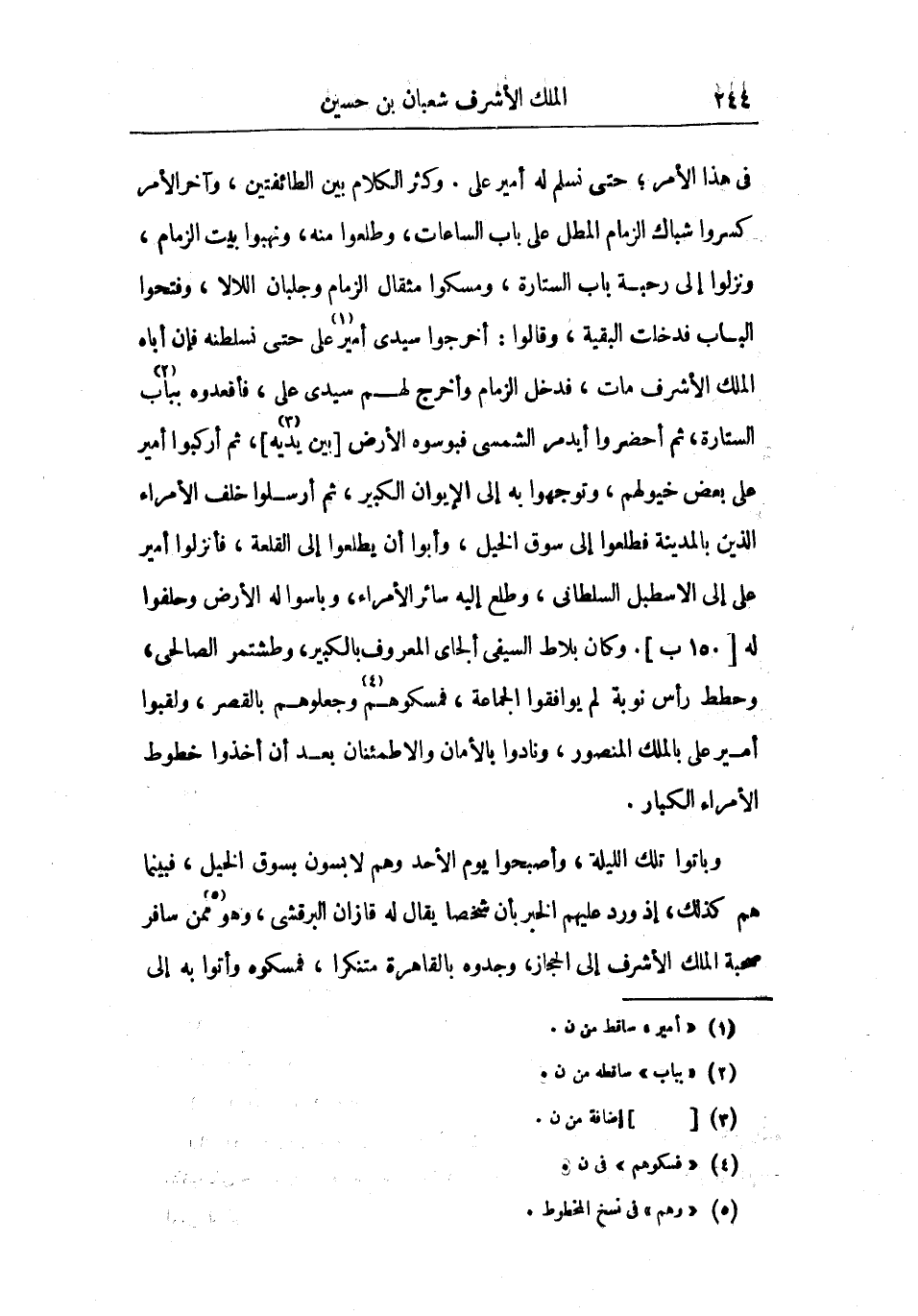 في هذا الأمر؛ حتى نسلم أمير علي. وكثر الكلام بين الطائفتين، وآخر الأمر كسروا شباك الزمام المطل على باب الساعات، وطلعوا منه، ونهبوا بيت الزمام، ونزلوا إلى رحبة باب الستارة، ومسكوا مثقال الزمام وجلبان اللالا، وفتحوا الباب فدخلت البقية، وقالوا: أخرجوا سيدي أمير علي حتى نسلطنه فإن أباه الملك الأشرف مات، فدخل الزمام وأخرج لهم سيدي علي، فأقعدوه بباب الستارة، ثم أحضروا أيدمر الشمسي فبوسوه الأرض بين يديه، ثم أركبوا أمير على بعض خيولهم، وتوجهوا به إلى الإيوان الكبير، ثم أرسلوا خلف الأمراء الذين بالمدينة فطلعوا إلى سوق الخيل، وأبوا أن يطلعوا إلى القلعة، فأنزلوا أمير علي إلى الأسطبل السلطاني، وطلع إليه سائر الأمراء، وباسوا له الأرض وحلفوا له وكان السيفي ألجاي المعروف بالكبير، وطشتمر الصالحي، وحطط رأس نوبة لم يوافقوا الجماعة، فمسكوهم وجعلوهم بالقصر، ولقبوا أمير علي بالملك المنصور، ونادوا بالأمان والاطمئنان بعد أن أخذوا خطوط الأمراء الكبار.
