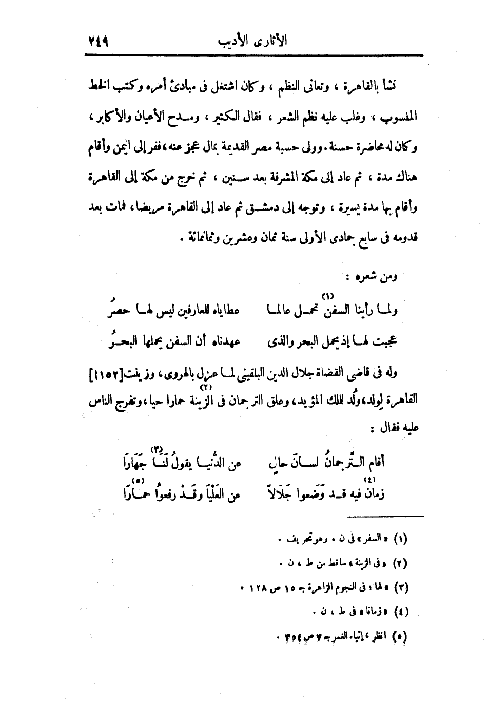 نشأ بالقاهرة، وتعاني النظم، وكان اشتغل في مباديء أمره وكتب الخط المنسوب، وغلب عليه نظم الشعر، فقال الكثير، ومدح الأعيان والأكابر، وكان له محاضرة حسنة. وولي حسبة مصر القديمة بمال عجز عنه، ففر إلى اليمن وأقام هناك مدة، ثم عاد إلى مكة المشرفة بعد سنين، ثم خرج من مكة إلى القاهرة وأقام بها مدة يسيرة، وتوجه إلى دمشق ثم عاد إلى القاهرة مريضاً، فمات بعد قدومه في سابع جمادى الأولى سنة ثمان وعشرين وثمانمائة.