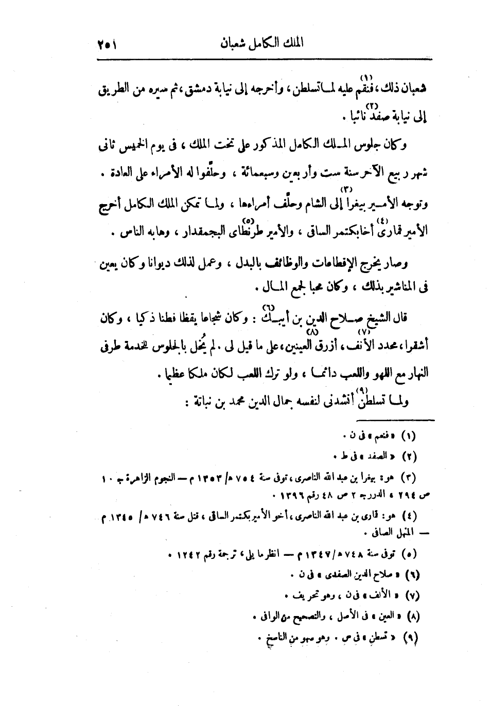 وكان جلوس الملك الكامل المذكور على تخت الملك، في يوم الخميس ثاني شهر ربيع الآخر سنة ست وأربعين وسبعمائة، وحلفوا له الأمراء على العادة. وتوجه الأمير بيغرا إلى الشام وحلف أمراءها، وملا تمكن الملك الكامل أخرج الأمير قماري أخابكتمر الساقي، والأمير طرنطاي البجمقدار، وهابه الناس.
