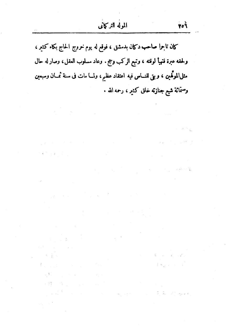 كان تاجراً صاحب دكان بدمشق، فوقع له يوم خروج الحاج بكاء كثير، ولحقه عبرة فتهيأ لوقته، وتبع الركب وحج. وعاد مسلوب العقل، وصار له حال مثل المولهين، وبقي للناس فيه اعتقاد عظيم، ولما مات في سنة ثمان وسبعين وستمائة شيع جنازته خلق كثير، رحمه الله