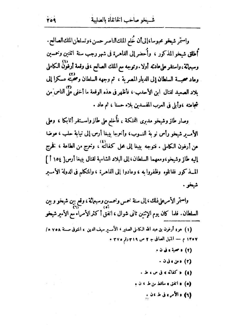 واستمر شيخو محبوساً، إلى أن خلع الملك الناصر حسن، وتسلطن الملك الصالح. أطلق شيخو المذكور، وأحضر إلى القاهرة في شهر رجب سنة اثنتين وخمسين وسبعمائة، واستقر على عادته أولاً. وتوجه مع الملك الصالح، في وقعة أرغون الكاملي وعاد صحبة السلطان إلى الديار المصرية، ثم وجهه السلطان وصحبته عسكراً إلى بلاد الصعيد لقتال ابن الأحدب، فأظهر في هذه الوقعة ما أخفى على الناس من شجاعته، وأبلى في العرب المفسدين بلاء حسناً، ثم عاد.