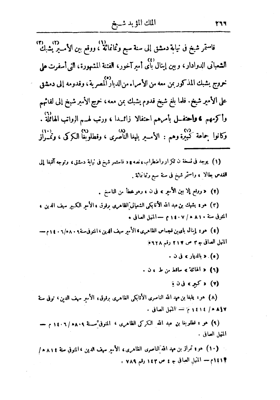 فاستمر شيخ في نيابة دمشق إلى سنة سبع وثمانمائة، ووقع بين الأمير يشبك الشعباني الدوادار، وبين إينال باي أمير آخور، الفتنة المشهورة، التي أسفرت على خروج يشبك المذكور بمن معه من الأمراء من الديار المصرية، وقدومه إلى دمشق على الأمير شيخ. فلما بلغ شيخ قدوم يشبك بمن معه، خرج الأمير شيخ إلى لقائهم وأكرمهم، واحتفل بأمرهم احتفالاً زائداً، ورتب لهم الرواتب الهائلة. وكانوا جماعة كبيرة وهم: الأمير يلبغا الناصري، وقطلوبغا الكركي، وتمراز
