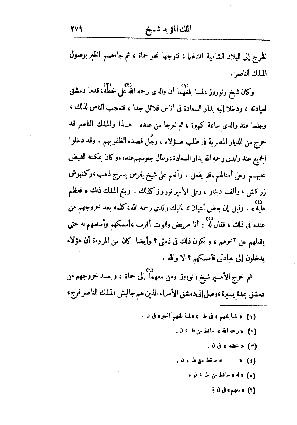 وكان شيخ ونوروز، لما بلغهما أن والدي رحمه الله على خطه، قدما دمشق لعيادته، وخلا إليه بدار السعادة في أناس قلائل جداً، فتعجب الناس لذلك، وجلسا عند والدي ساعة كبيرة، ثم خرجا من عنده. هذا والملك الناصر قد خرج من الديار المصرية في طلب هؤلاء، وجل قصده الظفر بهم. وقد دخلوا الجميع عند والدي رحمه الله بدار السعادة، وطال جلوسهم عنده، وكان يمكنه القبض عليهم وعلى أمثالهم، فلم يفعل. وأنعم على شيخ بفرس بسرج ذهب، وكنبوش زركش، وألف دينار، وعلى الأمير نوروز كذلك. وبلغ الملك ذلك فعظم عليه. وقيل إن بعض أعيان مماليك والدي رحمه الله، كلمه بعد خروجهم من عنده في ذلك، فقال له: أنا مريض وللموت أقرب، أمسكهم وأسلمهم له حتى يقتلهم عن آخرهم، ويكون ذلك في ذمتي؟ وأيضاً كان من المروءة أن هؤلاء يدخلون إلى عيادتي فأمسكهم؟ لا والله.