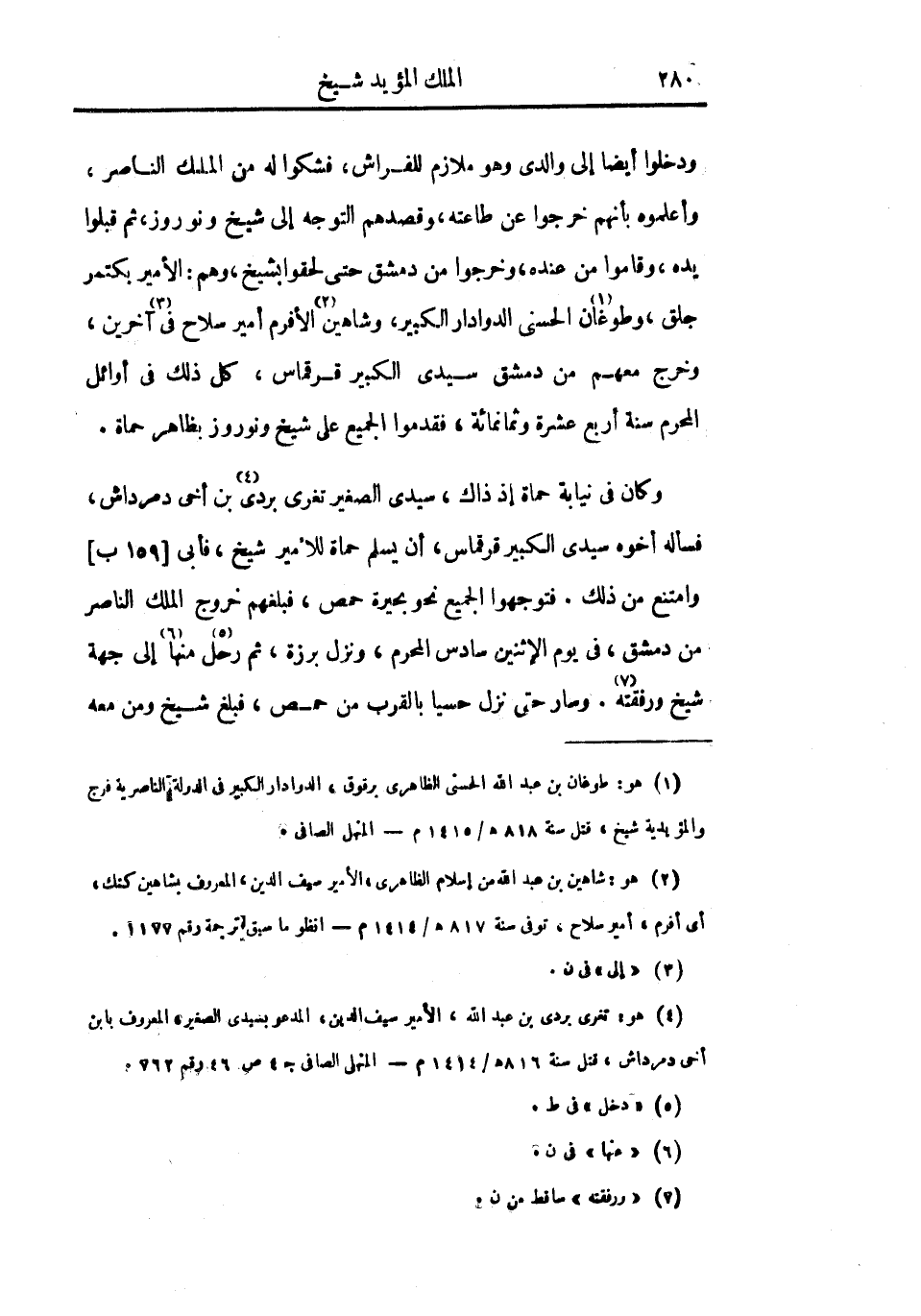 ودخلوا أيضاً إلى والدي وهو ملازم للفراش، فشكوا له من الملك الناصر، وأعلموه بأنهم خرجوا عن طاعته، وقصدهم التوجه إلى شيخ ونوروز، ثم قبلوا يده، وقاموا من عنده، وخرجوا من دمشق حتى لحقوا بشيخ، وهم: الأمير بكتمر جلق، وطوغان الحسني الدوادار الكبير، وشاهين الأفرم أمير سلاح في آخرين، وخرج معهم من دمشق سيدي الكبير قرقماس، كل ذلك في أوائل المحرم سنة أربع عشرة وثمانمائة، فقدموا الجميع على شيخ ونوروز بظاهر حماة.