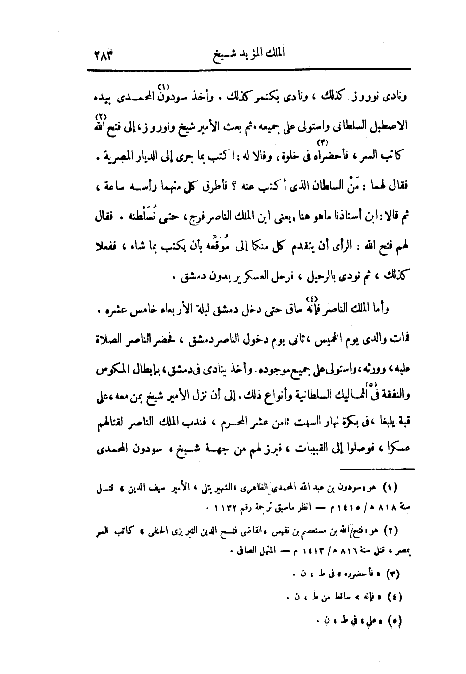 ونادى نوروز كذلك، ونادى بكتمر كذلك. وأخذ سودون المحمدي بيده الاصطبل السلطاني واستولى على جميعه. ثم بعث الأمير شيخ ونوروز، إلى فتح الله كاتب السر، فأحضراه في خلوة، وقالا له: اكتب بما جرى إلى الديار المصرية. فقال لهما: من السلطان الذي أكتب عنه؟ فاطرق كل منهما رأسه ساعة، ثم قالا: ابن أستاذنا ما هو هنا، يعني ابن الملك الناصر فرج، حتى نسلطنه. فقال لهم فتح الله: الرأي أن يتقدم كل منكما إلى موقعه بأن يكتب بما شاء، ففعلا كذلك، ثم نودي بالرحيل، فرحل العسكر يريدون دمشق.