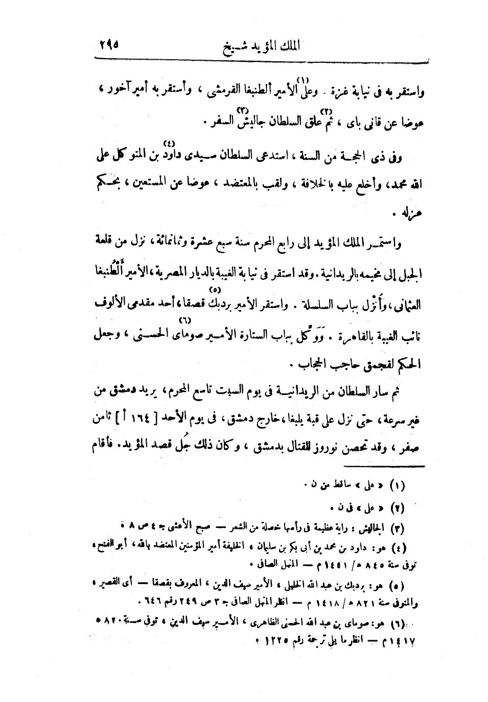 واستمر الملك المؤيد إلى رابع المحرم سنة عشرة وثمانمائة، نزل من قلعة الجبل إلى مخيمه بالريدانية. وقد استقر في نيابة الغيبة بالديار المصرية، الأمير ألطنبغا العثماني، وأنزل بباب السلسلة. واستقر الأمير بردبك قصقا، أحد مقدمي الألوف نائب الغيبة بالقاهرة. وكل بباب الستارة الأمير صوماي الحسني، وجعل الحكم لقجمق حاجب الحجاب.