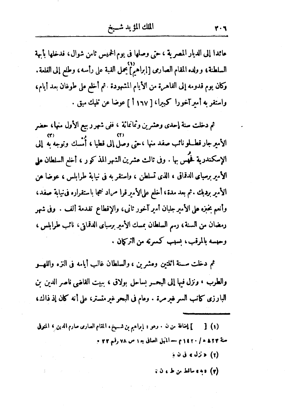 عائداً إلى الديار المصرية، حتى وصلها في يوم الخميس ثامن شوال، فدخلها بأبهة السلطنة، وولده المقام الصارمي إبراهيم يحمل القبة على رأسه، وطلع إلى القلعة. وكان يوم قدومه إلى القاهرة من الأيام المشهودة، ثم أخلع على طوغان بعد أيام، واستقر به أمير آخورا كبيرا، عوضاً عن تنبك ميق.