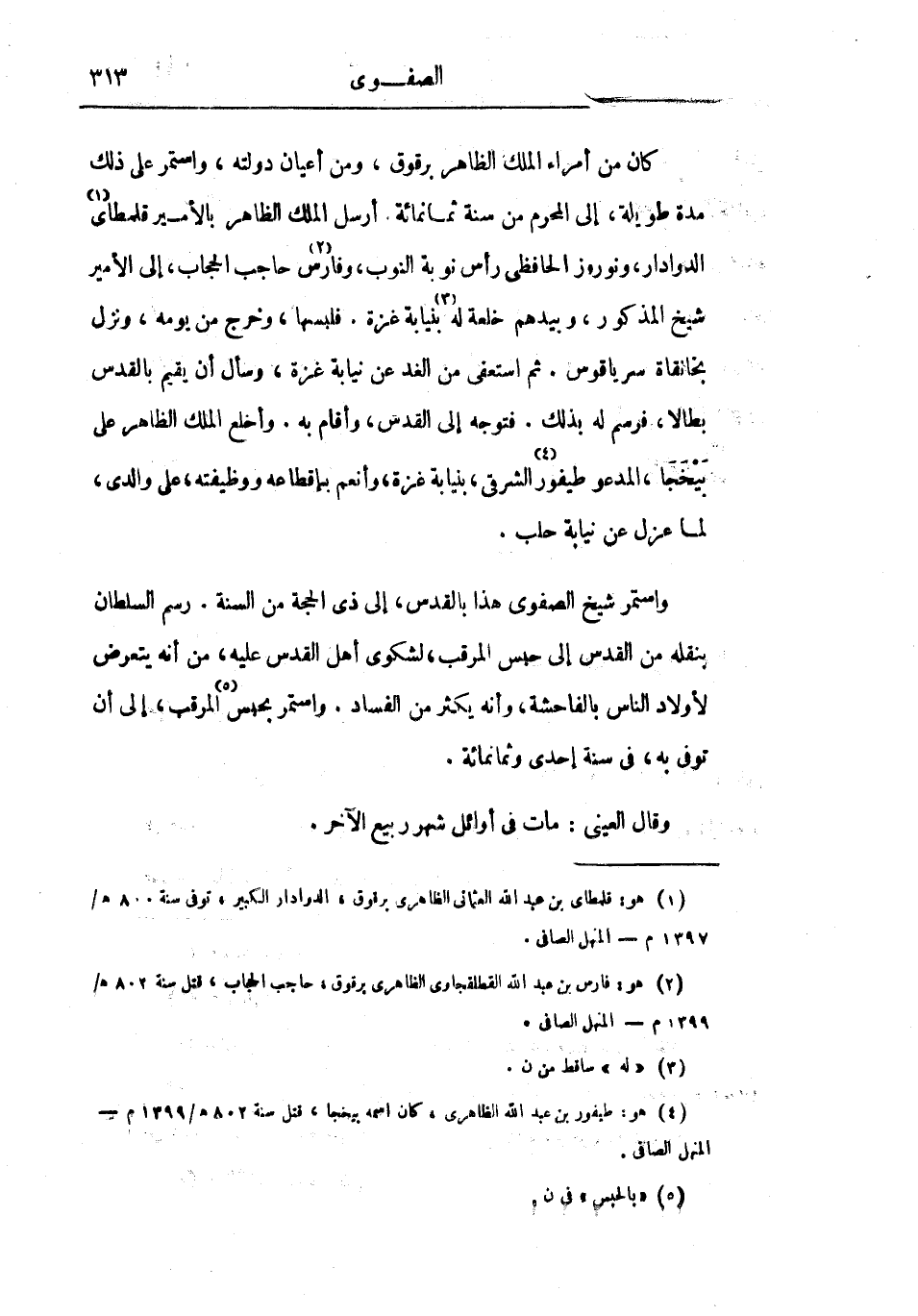 واستمر شيخ الصفوي هذا بالقدس، إلى ذي الحجة من السنة. رسم السلطان بنقله من القدس إلى حبس المرقب، لشكوى أهل القدس عليه، من أنه يتعرض لأولاد الناس بالفاحشة، وأنه يكثر من الفساد. واستمر بحبس المرقب، إلى أن توفي به، في سنة إحدى وثمانمائة.