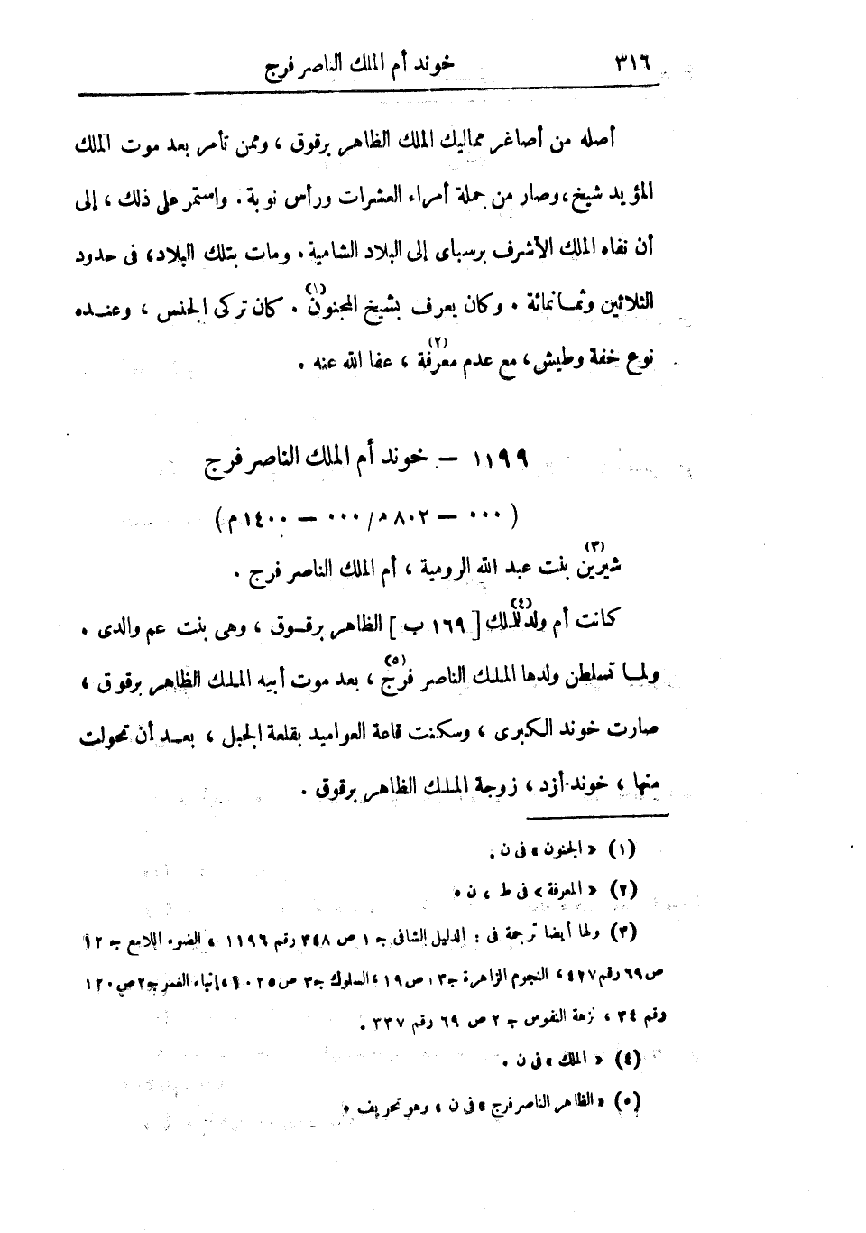 كانت أم ولد للملك الظاهر برقوق، وهي بنت عم والدي. ولما تسلطن ولدها الملك الناصر فرج، بعد موت أبيه الملك الظاهر برقوق، صارت خوند الكبرى، وسكنت قاعة العواميد بقلعة الجبل، بعد أن تحولت منها، خوند أزد، زوجة الملك الظاهر برقوق.