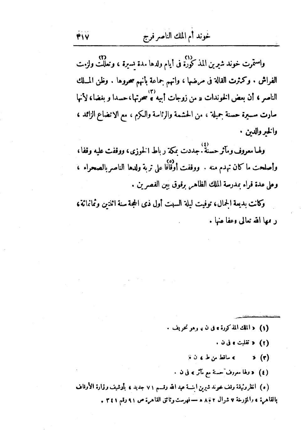 واستمرت خوند شيرين المذكورة في أيام ولدها مدة يسيرة، وتعللت ولزمت الفراش. وكثرت القالة في مرضها، واتهم جماعة بأنهم سحروها. وظن الملك الناصر، أن بعض الخوندات من زوجات أبيه سحرتها، حسداً وبغضاً، لأنها سارت سيرة حسنة جميلة، من الحشمة والرئاسة والكرم، مع الاتضاع الزائد، والخير والدين.