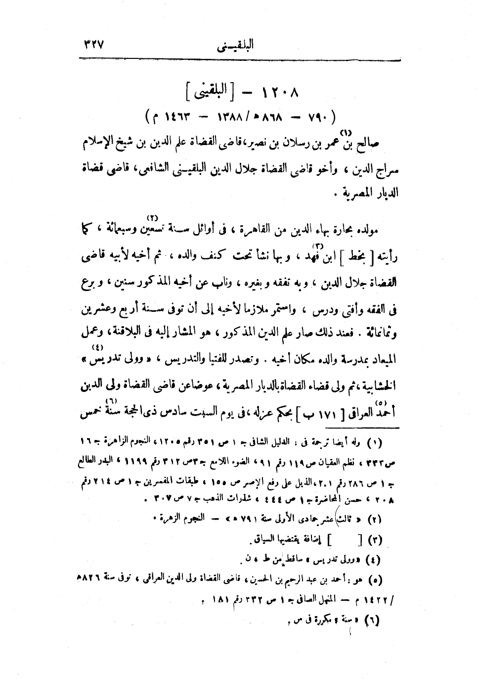 مولده بحارة بهاء الدين من القاهرة، في أوائل سنة تسعين وسبعمائة، كما رأيته بخط ابن فهد، وبها نشأ تحت كنف والده، ثم أخيه لأبيه قاضي القضاة جلال الدين، وبه تفقه وبغيره، وناب عن أخيه المذكور سنين، وبرع في الفقه وأفتى ودرس، واستمر ملازماً لأخيه إلى أن توفي سنة أربع وعشرين وثمانمائة. فعند ذلك صار علم الدين المذكور، هو المشار إليه في البلاقنة، وعمل الميعاد بمدرسة والده مكان أخيه. وتصدر للفتيا والتدريس، وولى تدريس الخشابية، ثم ولي قضاء القضاة بالديار المصرية، عوضاً عن قاضي القضاة ولي الدين أحمد العراقي بحكم عزله، في يوم السبت سادس ذي الحجة سنة خمس
