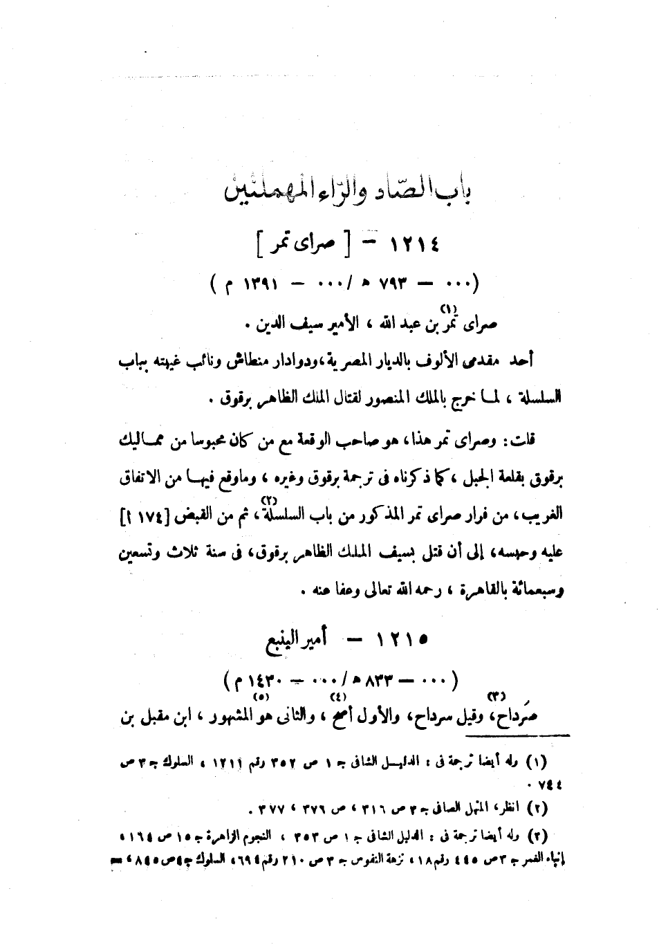 قلت: وصراي تمر هذا، هو صاحب الوقعة مع من كان محبوساً من مماليك برقوق بقلعة الجبل، كما ذكرناه في ترجمة برقوق وغيره، وما وقع فيها من الاتفاق الغريب، من فرار صراي تمر المذكور من باب السلسلة، ثم من القبض عليه وحبسه، إلى أن قتل بسيف الملك الظاهر برقوق، في سنة ثلاث وتسعين وسبعمائة بالقاهرة، رحمه الله تعالى وعفا عنه.