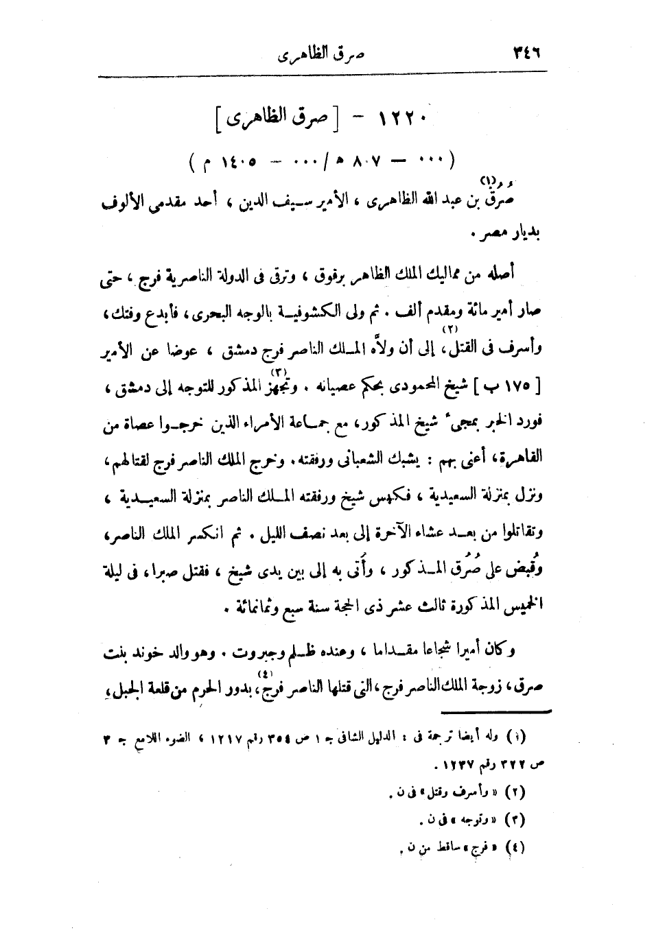 أصله من مماليك الملك الظاهر برقوق، وترق، وترقي في الدولة الناصرية فرج، حتى صار أمير مائة ومقدم ألف. ثم ولى الكشوفية بالوجه البحري، فأبدع وفتك، وأشرف في القتل، إلى أن ولاه الملك الناصر فرج دمشق، عوضا عن الأمير شيخ المحمودي بحكم عصيانه. وتجهز المذكور للتوجه إلى دمشق، فورد الخبر بمجيء شيخ المذكور، مع جماعة الأمراء الذين خرجوا عصاة من القاهرة، أعنى بهم: يشبك الشعباني ورفقته. وخرج الملك الناصر فرج لقتالهم، ونزل بمنزلة السعيدية، فكبس شيخ ورفقته الملك الناصر بمنزلة السعيدية، وتقاتلوا من بعد عشاء الآخرة إلى بعد نصف الليل. ثم انكسر الملك الناصر، وقبض على صرق المذكور، وأتى به إلى بين يدي شيخ، فقتل صبرا، في ليلة الخميس المذكورة ثالث عشر ذي الحجة سنة سبع وثمانمائة.