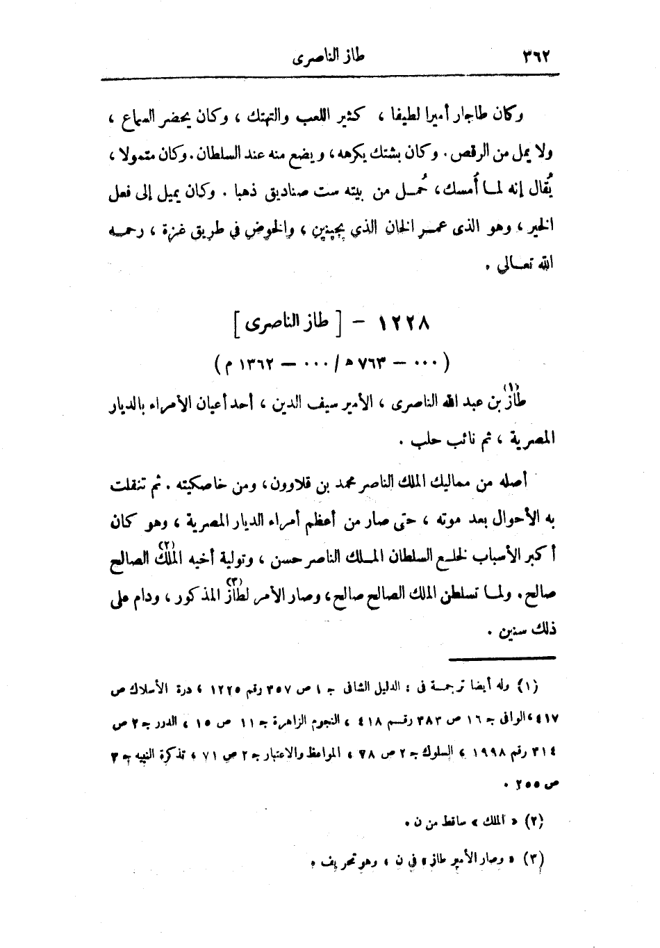 أصله من مماليك الملك الناصر محمد بن قلاوون، ومن خاصكيته. ثم تنقلت به الأحوال بعد موته، حتى صار من أعظم أمراء الديار المصرية، وهو كان أكبر الأسباب لخلع السلطان الملك الناصر حسن، وتولية أخيه الملك الصالح صالح. ولما تسلطن الملك الصالح صالح، وصار الأمر لطاز المذكور، ودام على ذلك سنين.