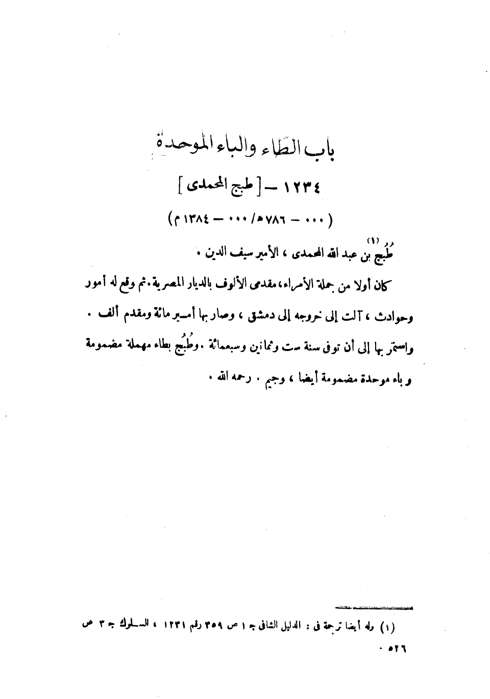 كان أولا من جملة الأمراء، مقدمي الألوف بالديار المصرية. ثم وقع له أمور وحوادث، آلت إلى خروجه إلى دمشق، وصار بها أمير مائة ومقدم ألف. واستمر بها إلى أن توفي سنة ست وثمانين وسبعمائة. وطبج بطاء مهملة مضمومة وباء موحدة مضمومة أيضاً، وجيم. رحمه الله.