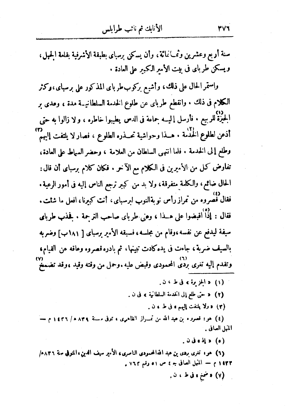 واستمر الحال على ذلك، وأشيع بركوب طرباي المذكور على برسباي، وكثر الكلام في ذلك. وانقطع طرباي عن طلوع الخدمة السلطانية مدة، وعدى بر الجيزة للربيع. فأرسل إليه جماعة في الدس يطيبوا خاطره، ولا زالوا به حتى أذعن لطلوع الخدمة. هذا وحواشية تحذره الطلوع، فصار لا يلتفت إليهم وطلع إلى الخدمة. فلما انتهى السلطان من العلامة، وحضر السماط على العادة، تفاوض كل من الأميرين في الكلام مع الآخر. فكان كلام برسباي أن قال: الحال ضائع، والكلمة متفرقة، ولا بد من كبير ترجع الناس إليه في أمور الرعية. فقال قصروه من تمراز رأس نوبة النوب لبرسباي، أنت كبيرنا، افعل ماشئت. فقال: إذا اقبضوا على هذا، وعني طرباي صاحب الترجمة. فجذب طرباي سيفة ليدفع عن نفسه، وقام من مجلسه، فسبقه الأمير برسباي وضربه بالسيف ضربة، جاءت في يده كادت تبينها، ثم بادره قصروه وعاقه عن القيام، وتقدم إليه تغرى بردى المحمودي وقبض عليه. وحمل من وقته وقيد، وقد تضمخ