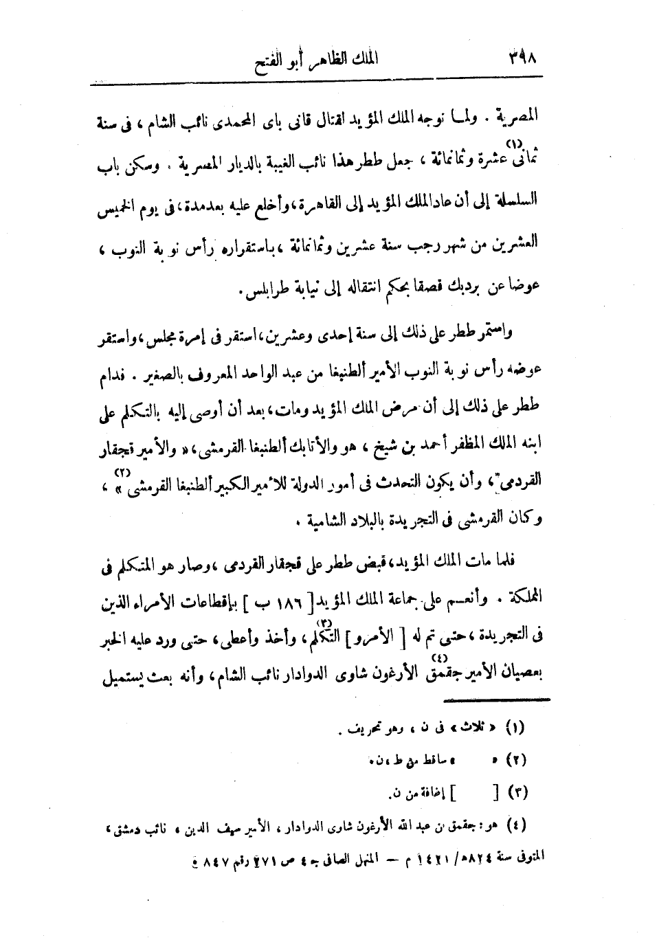 المصرية. ولما توجه الملك المؤيد لقتال قاني باي المحمدي نائب الشام، في سنة ثماني عشرة وثمانمائة، جعل ططر هذا نائب الغيبة بالديار المصرية، وسكن باب السلسلة إلى أن عاد الملك المؤيد إلى القاهرة، وأخلع عليه بعد مدة، في يوم الخميس العشرين من شهر رجب سنة عشرين وثمانمائة، باستقراره رأس نوبة النوب، عوضاً عن بردبك قصقا بحكم انتقاله إلى نيابة طرابلس.