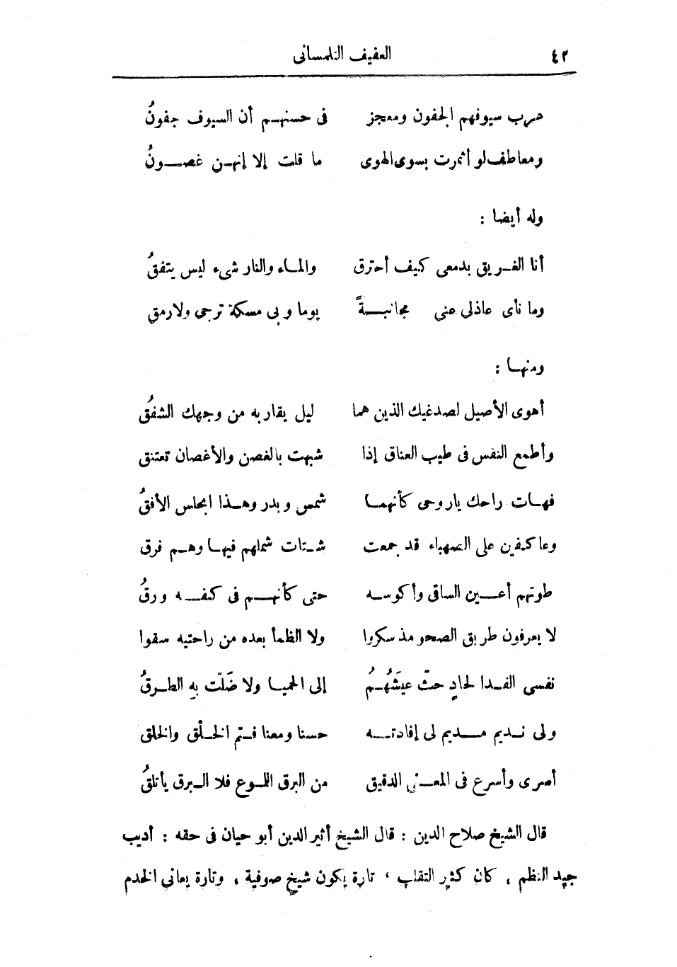 قال الشيخ صلاح الدين: قال الشيخ أثير الدين أبو حيان في حقه: أديب جيد النظم، كان كثير التقلب، تارة يكون شيخ صوفية، وتارة يعاني الخدم