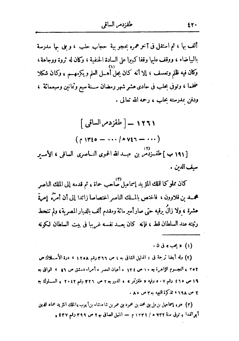 ألف بها، ثم استقل في آخر عمره بحجوبية حجاب حلب، وبنى بها مدرسة بالبياضاء، ووقف عليها وقفاً كبيراً على السادة الحنفية، وكان له ثروة ووجاهة، وكان فيه ظلم وتعسف، إلا أنه كان يجل أهل العلم ويكرمهم، وكان شكلاً ضخماً، وتوفي بحلب في حادي عشر شهر رمضان سنة سبع وثمانين وسبعمائة، ودفن بمدرسته بحلب، رحمه الله تعالى.