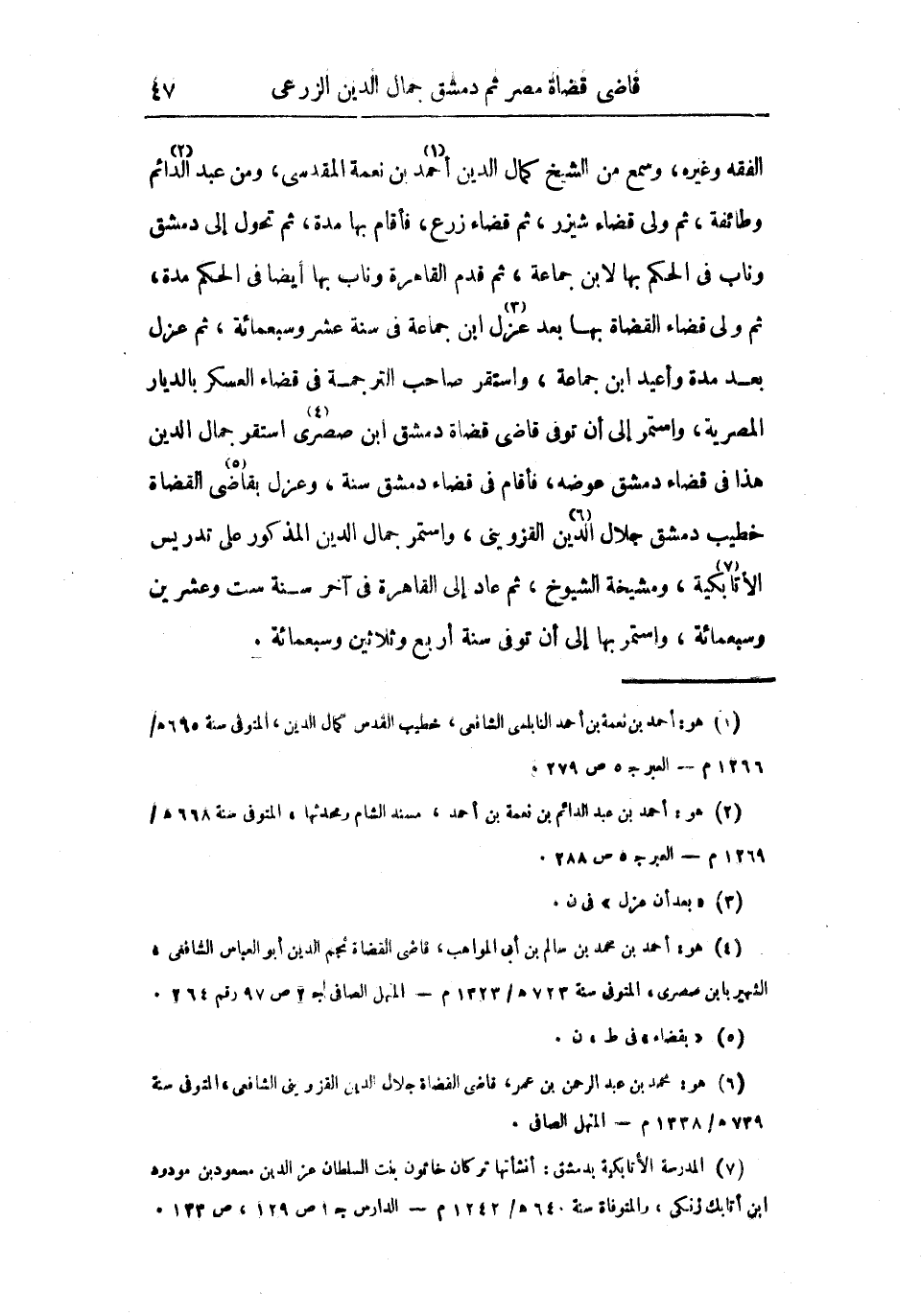 الفقه وغيره، وسمع من الشيخ كمال الدين أحمد بن نعمة المقدسي، ومن عبد الدائم وطائفة، ثم ولى قضاء شيزر، ثم قضاء زرع، فأقام بها مدة، ثم تحول إلى دمشق وناب في الحكم بها لابن جماعة، ثم قدم القاهرة وناب بها أيضا في الحكم مدة، ثم ولى قضاء القضاة بها بعد عزل ابن جماعة في سنة عشر وسبعمائة، ثم عزل بعد مد وأعيد ابن جماعة، واستقر صاحب الترجمة في قضاء العسكر بالديار المصرية، واستمر إلى أن توفي قاضي قضاة دمشق ابن صصري استقر جمال الدين هذا في قضاء دمشق عوضه، فأقام في قضاء دمشق سنة، وعزل بقاضي القضاة خطيب دمشق جلال الدين القزويني، واستمر جمال الدين المذكور على تدريس الأتابكية، ومشيخة الشيوخ، ثم عاد إلى القاهرة في آخر سنة ست وعشرين وسبعمائة، واستمر بها إلى أن توفي سنة أربع وثلاثين وسبعمائة.
