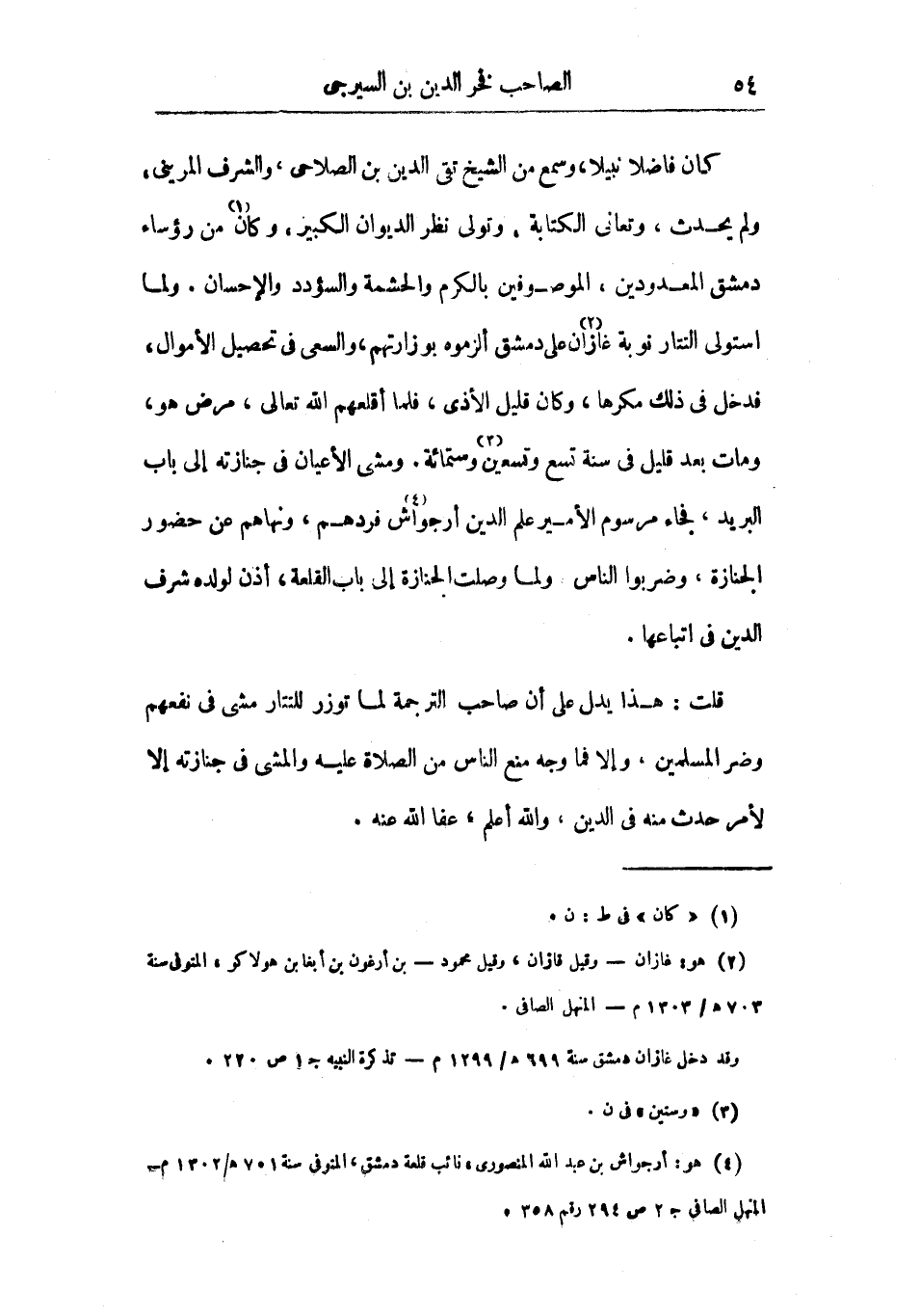 قلت: هذا يدل على أن صاحب الترجمة لما توزر للتتار مشى في نفعهم وضر المسلمين، وإلا فما وجه منع الناس من الصلاة عليه والمشي في جنازته إلا لأمر حدث منه في الدين، والله أعلم، عفا الله عنه.
