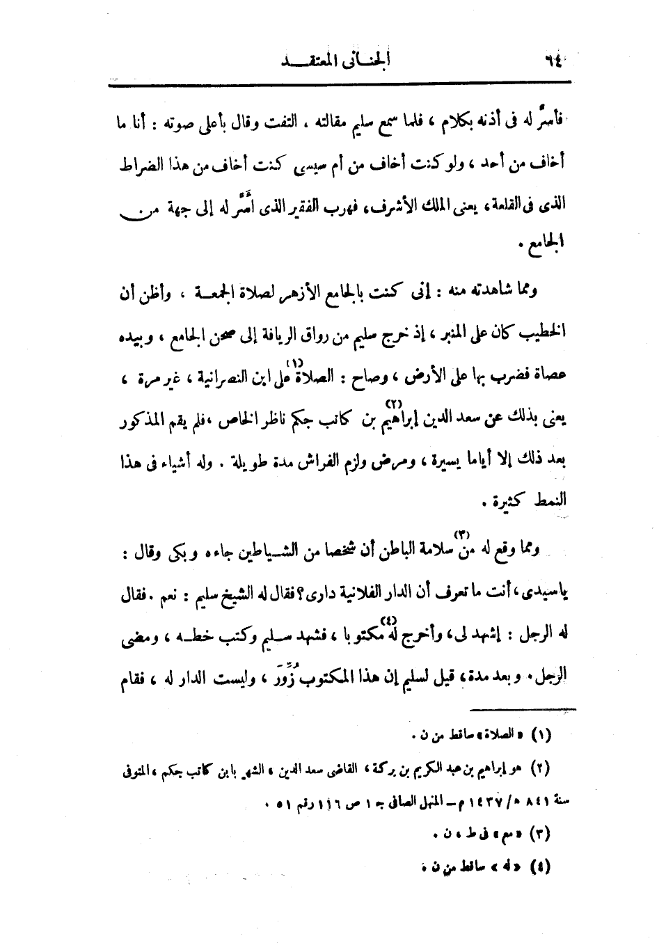 ومما شاهدته منه: إني كنت بالجامع الأزهر لصلاة الجمعة، وأظن أن الخطيب كان على المنبر، إذ خرج سليم من رواق الريافة إلى صحن الجامع، وبيده عصاة فضرب بها على الأرض، وصاح: الصلاة على ابن النصرانية، غير مرة، يعني بذلك عن سعد الدين إبراهيم بن كاتب جكم ناظر الخاص، فلم يقم المذكور بعد ذلك إلا أياماً يسيرة، ومرض ولزم الفراش مدة طويلة. وله أشياء في هذا النمط كثيرة.