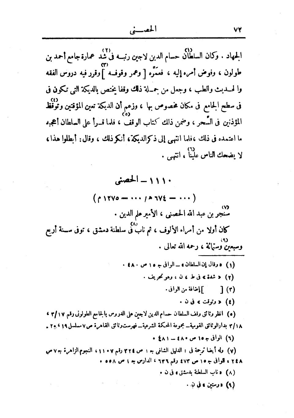 الجهاد. وكان السلطان حسام الدين لاجين رتبه في شد عمارة جامع أحمد بن طولون، وفوض أمره إليه، فعمره وعمر وقوفه وقرر فيه دروس الفقه والحديث والطب، وجعل من جملة ذلك وقفاً يختص بالديكة التي تكون في سطح الجامع في مكان مخصوص بها، وزعم أن الديكة تعين المؤقتين وتوقظ المؤذنين في السحر، وضمن ذلك كتاب الوقف، فلما قرأ على السلطان أعجبه ما اعتمده في ذلك، فلما انتهى إلى ذكر الديكة، أنكر ذلك، وقال: أبطلوا هذا، لا يضحك الناس علينا، انتهى.