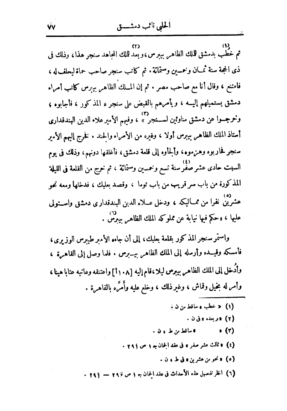 ثم خطب بدمشق للملك الظاهر بيبرس، وبعد للملك المجاهد سنجر هذا، وذلك في ذي الحجة سنة ثمان وخمسين وستمائة. ثم كاتب سنجر صاحب حماة ليحلف له، فامتنع، وقال أنا مع صاحب مصر. ثم إن الملك الظاهر بيبرس كاتب أمراء دمشق يستميلهم إليه، ويأمرهم بالقبض على سنجر المذكور، فأجابوه، وخرجوا عن دمشق مناوئين لسنجر، وفيهم الأمير علاء الدين البندقداري أستاذ الملك الظاهر بيبرس أولاً، وغيره من الأمراء والجند. فخرج إليهم الأمير سنجر فحاربوه وهزموه، وألجأوه إلى قلعة دمشق، فأغلقها دونهم، وذلك في يوم السبت حادي عشر صفر سنة تسع وخمسين وستمائة، ثم خرج من القلعة في الليلة المذكورة من باب سر قريب من باب توما، وقصد بعلبك، فدخلها ومعه نحو عشرين نفراً من مماليكه، ودخل علاء الدين البندقداري دمشق واستولى عليها، وحكم فيها نيابة عن مملوكه الملك الظاهر بيبرس.