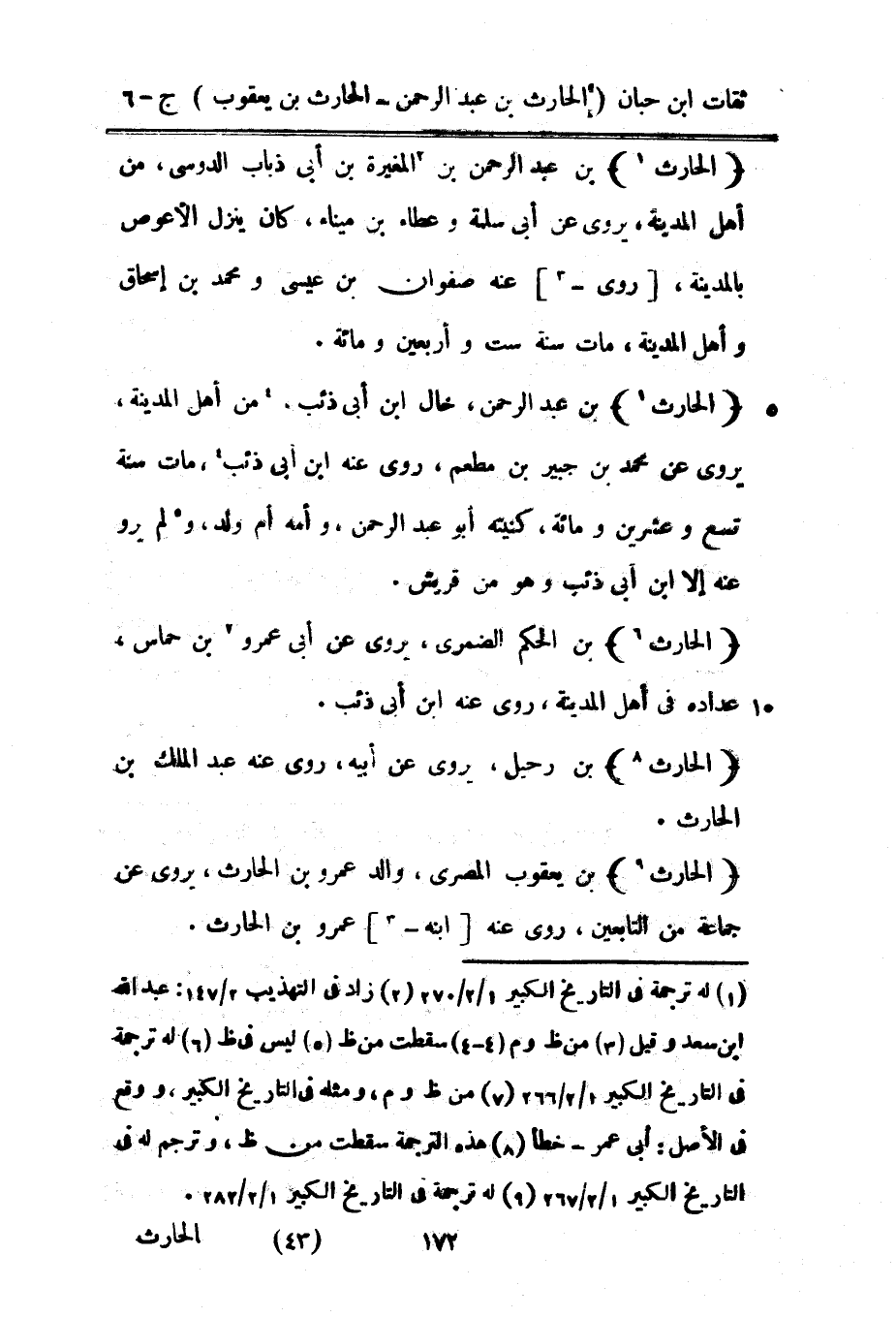 7215 - الْحَارِث بن عبد الرَّحْمَن خَال بن أبي ذِئْب من أهل الْمَدِينَة يروي عَن مُحَمَّد بن جُبَير بن مطعم روى عَنهُ بْن أَبِي ذِئْب مَاتَ سنة تسع وَعشْرين وَمِائَة كنيته أَبُو عبد الرَّحْمَن وَأمه أم ولد وَلم يرو عَنهُ إِلَّا بن أبي ذِئْب وَهُوَ من قُرَيْش
