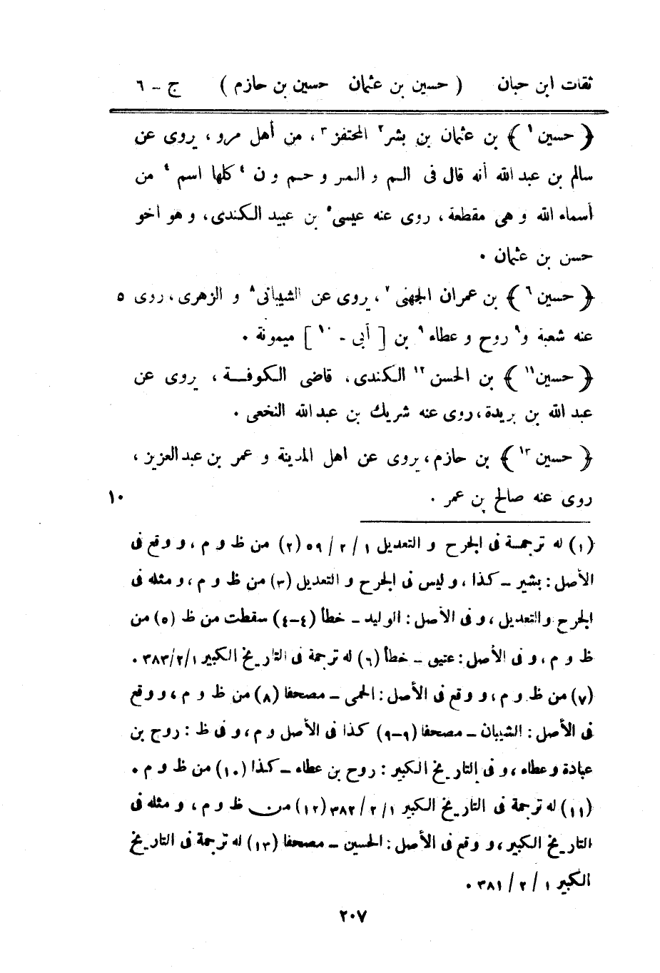 7392 - حُسَيْن بن عُثْمَان بن بشر المحتفز من أهل مرو يروي عَن سَالم بن عبد الله أَنه قَالَ فِي ألم والمر وحم ون كلهَا اسْم من أَسمَاء الله وَهِي مقطعَة روى عَنهُ عِيسَى بن عبيد الْكِنْدِيّ وَهُوَ أَخُو حسن بن عُثْمَان