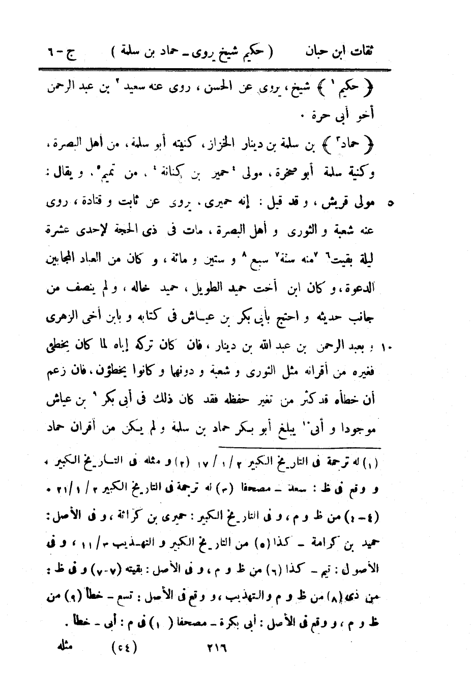 7434 - حَمَّاد بن سَلمَة بن دِينَار الخزاز كنيته أَبُو سَلمَة من أهل الْبَصْرَة وكنية سَلمَة أَبُو صَخْرَة مولى حمير بن كنَانَة من تَمِيم وَيُقَال مولى قُرَيْش وَقد قيل إِنَّه حميري يروي عَن ثَابت وَقَتَادَة روى عَنهُ شُعْبَة وَالثَّوْري وَأهل الْبَصْرَة مَاتَ فِي ذِي الْحجَّة لإحدى عشرَة لَيْلَة بقيت مِنْهُ سنة سبع وَسِتِّينَ وَمِائَة وَكَانَ من الْعباد المجابين الدعْوَة وَكَانَ بن أُخْت حميد الطَّوِيل حميد خَاله وَلم ينصف من جَانب حَدِيثه وَاحْتج بِأبي بكر بن عَيَّاش فِي كِتَابه وبابن أخي الزُّهْرِيّ وَبِعَبْد الرَّحْمَن بن عبد الله بن دِينَار فَإِن كَانَ تَركه إِيَّاه لما كَانَ يخطىء فَغَيره من أقرانه مثل الثَّوْريّ وَشعْبَة ودونهما وَكَانُوا يخطؤن فَإِن زعم أَن خطأه قد كثر من تغير حفظه فقد كَانَ ذَلِك فِي أبي بكر بن عَيَّاش مَوْجُودا وأنى يبلغ أَبُو بكر حَمَّاد بن سَلمَة وَلم يكن من أَقْرَان حَمَّاد